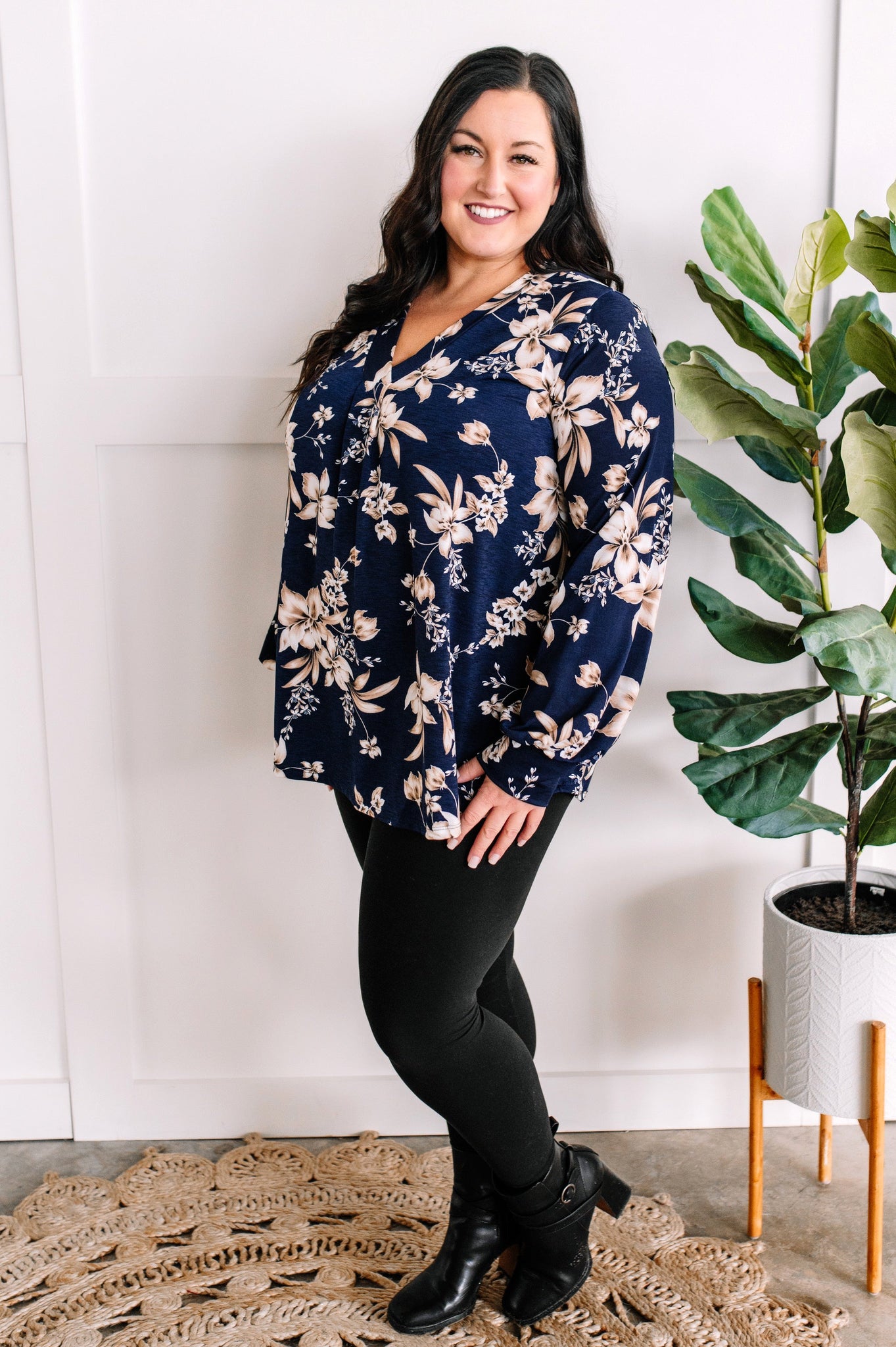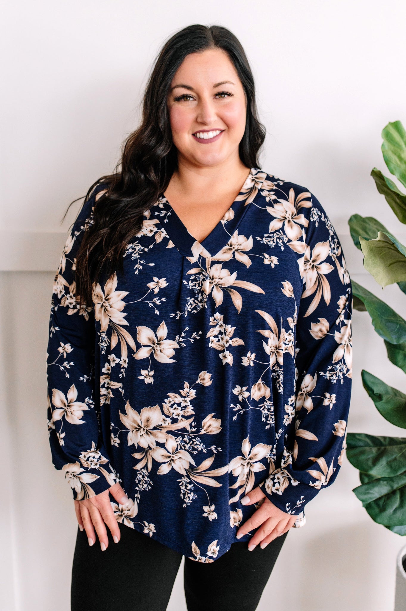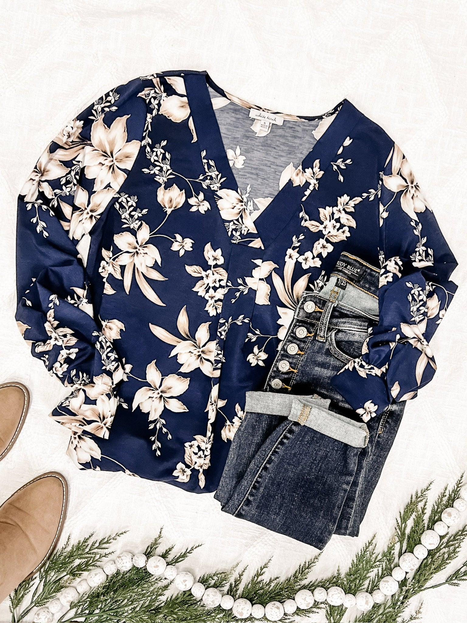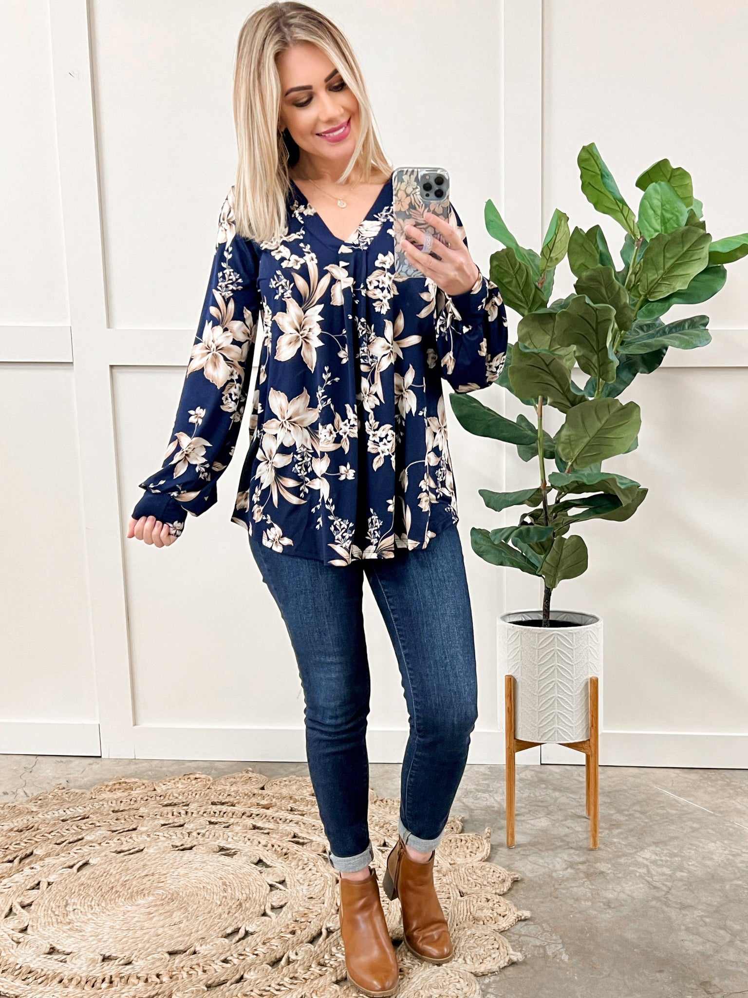 Floral Print Top With Elastic Sleeve In Navy & Natural