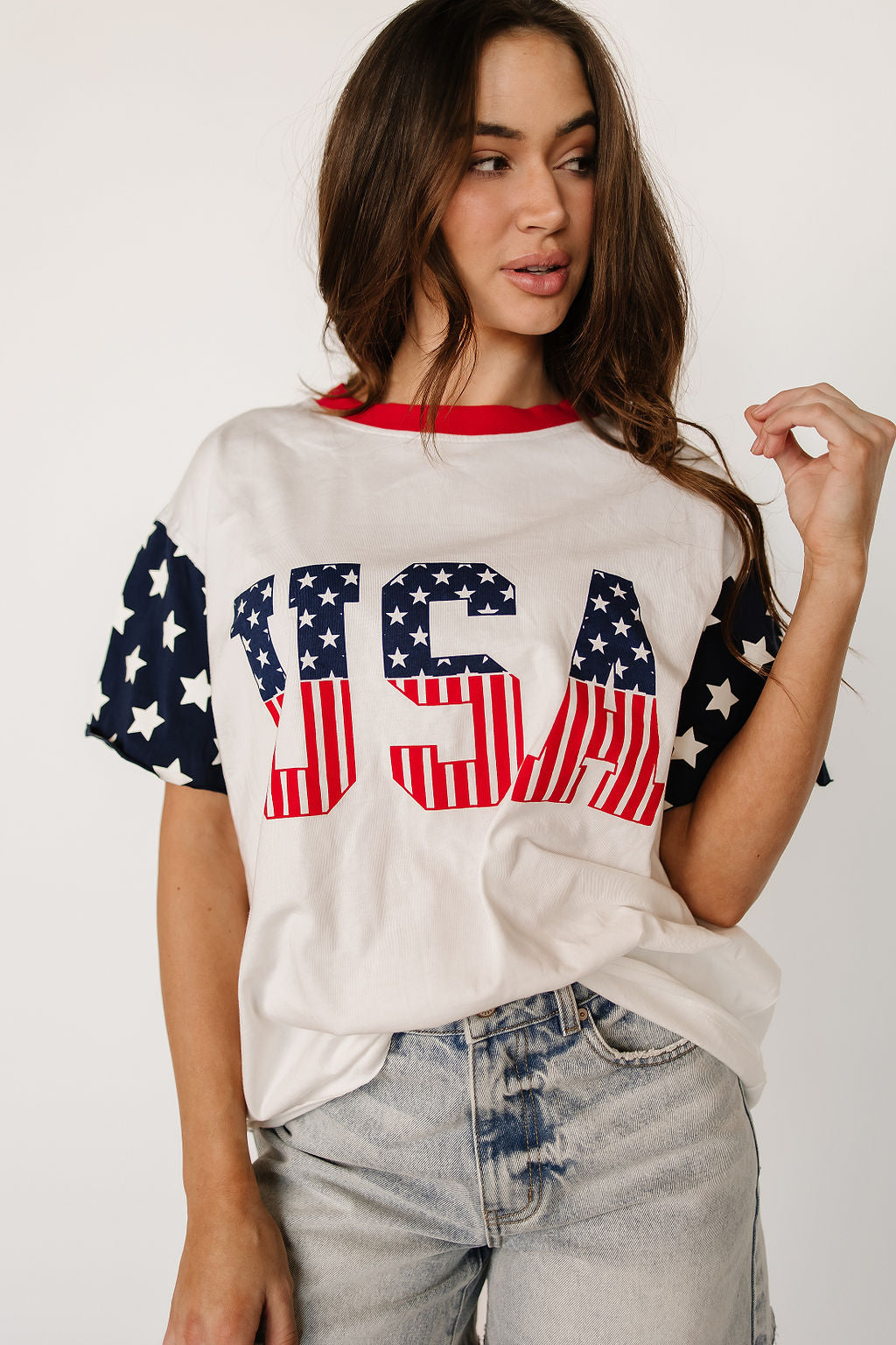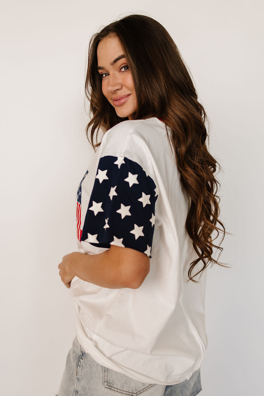This oversized tee is everything- cute & soft with exposed back seam detailing for that extra something. The stars & stripes that will set you apart this 4th of July!
