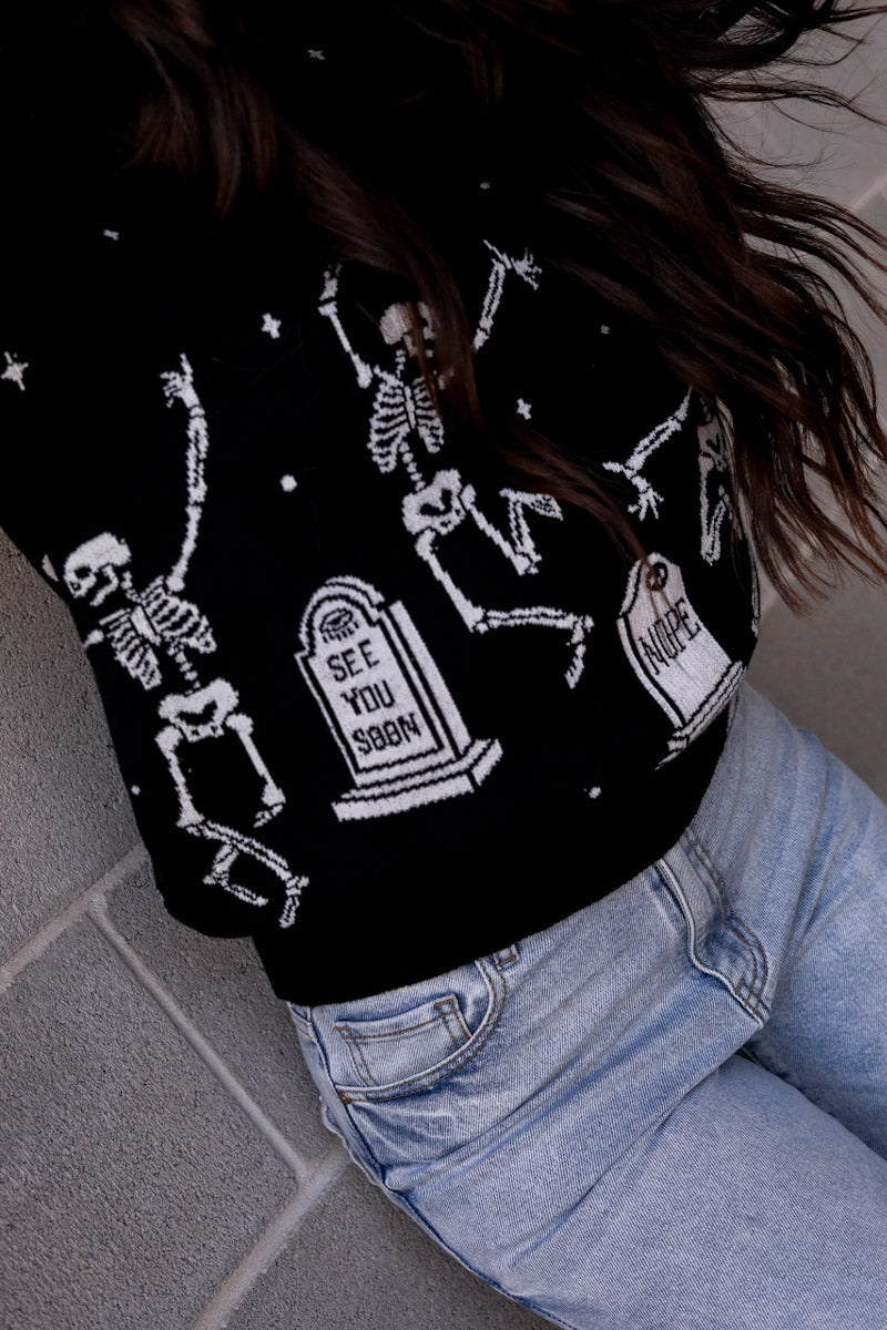 Embrace the fun size of Halloween. This knit sweater is soft and slightly oversized to give you room to groove all night long!