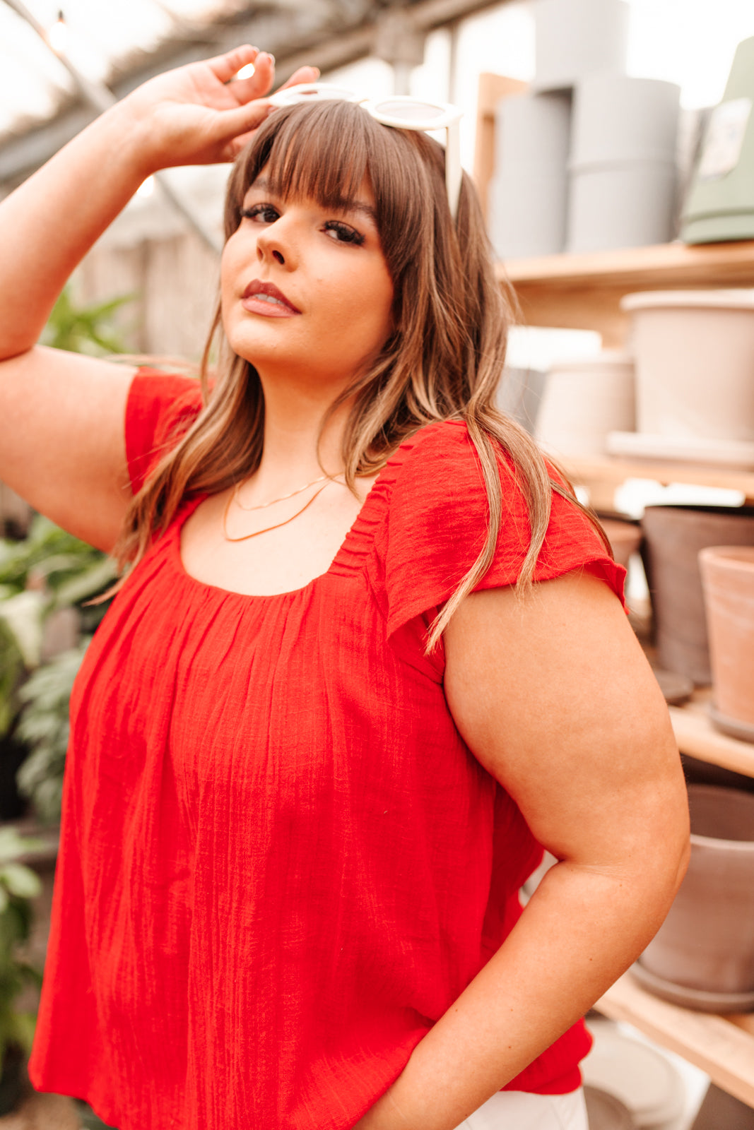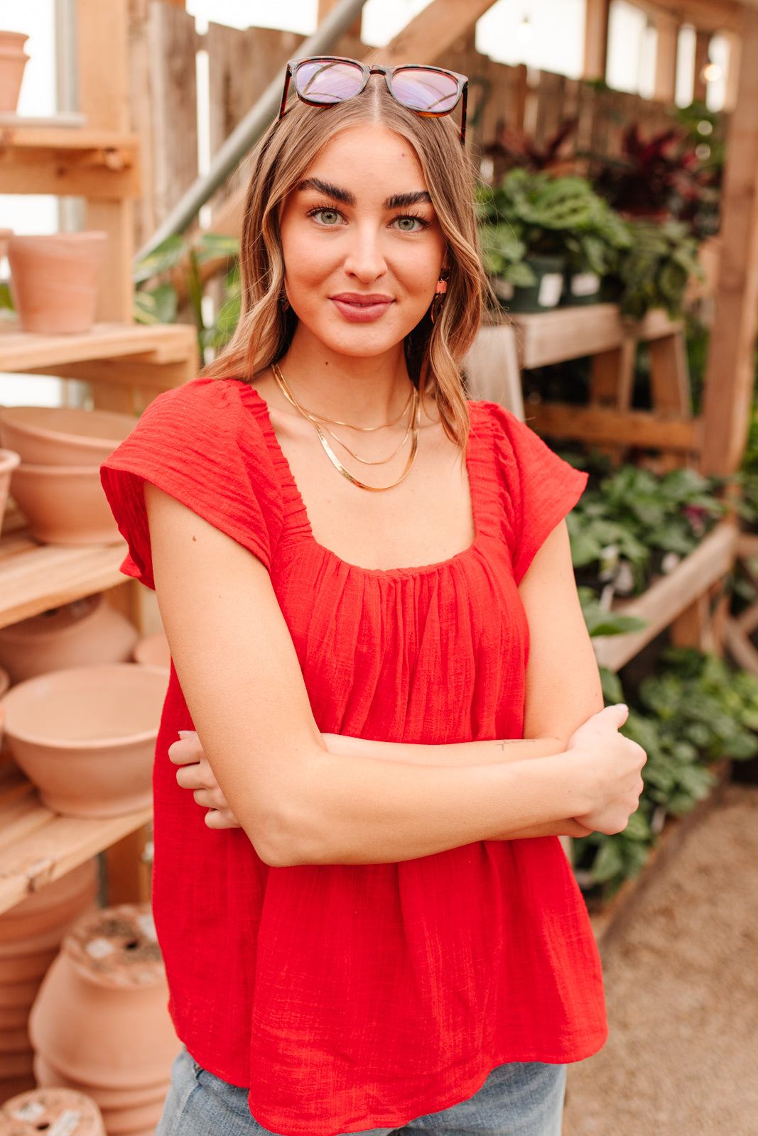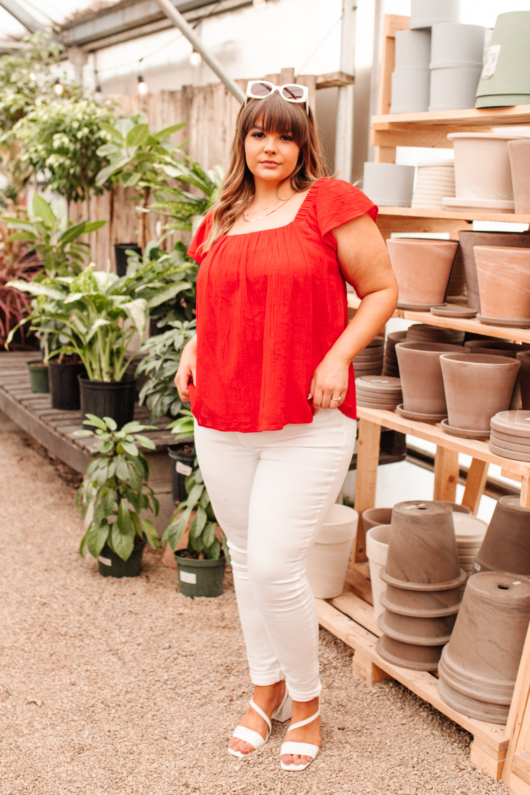 Start your day right with the Back Of My Mind Top! This adorable red top features flutter sleeves with elastic detail, square neckline, and a-line silhouette. Pair this lightweight gauzy top with white denim, and sandals for a cute summer look!