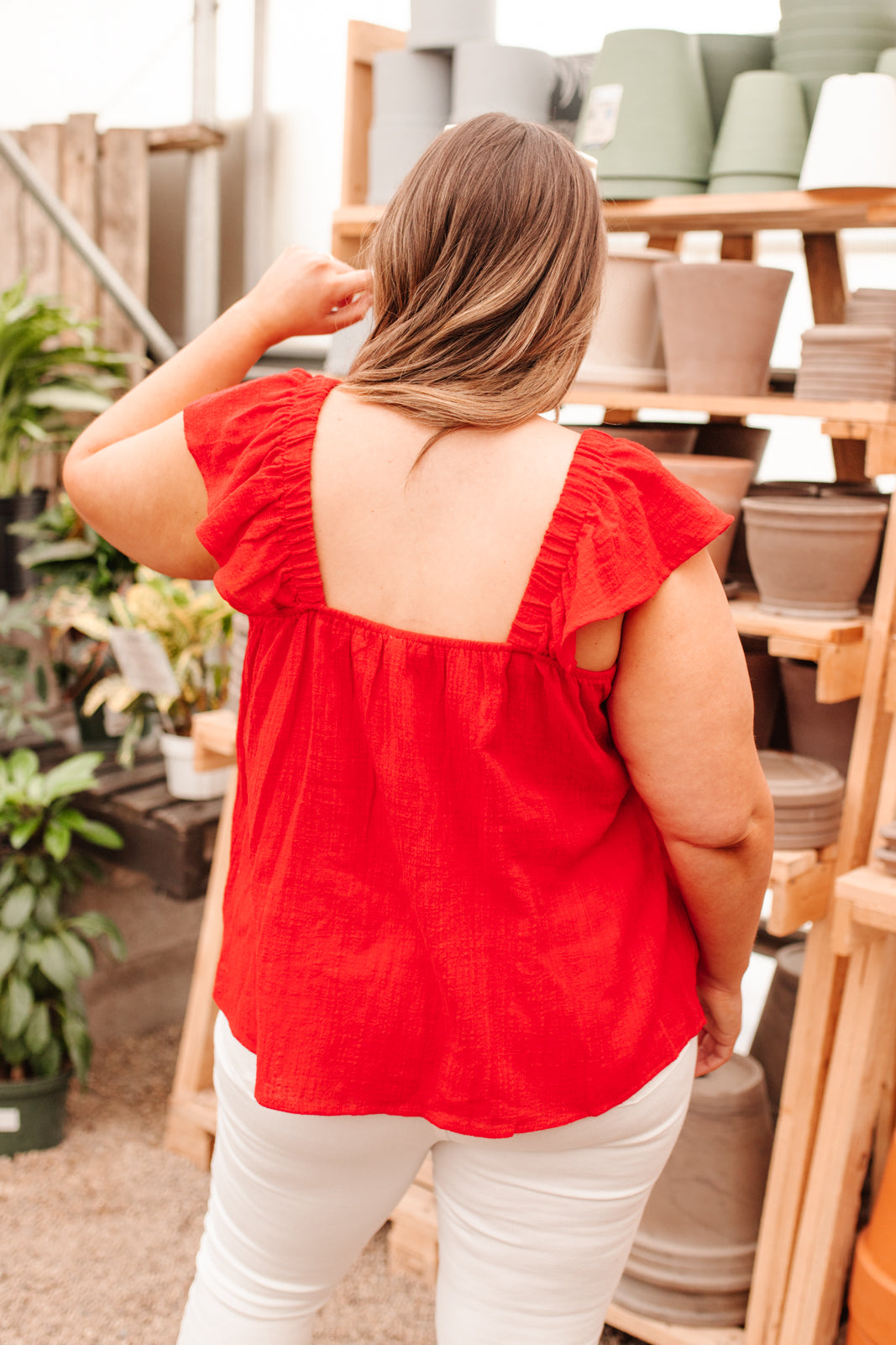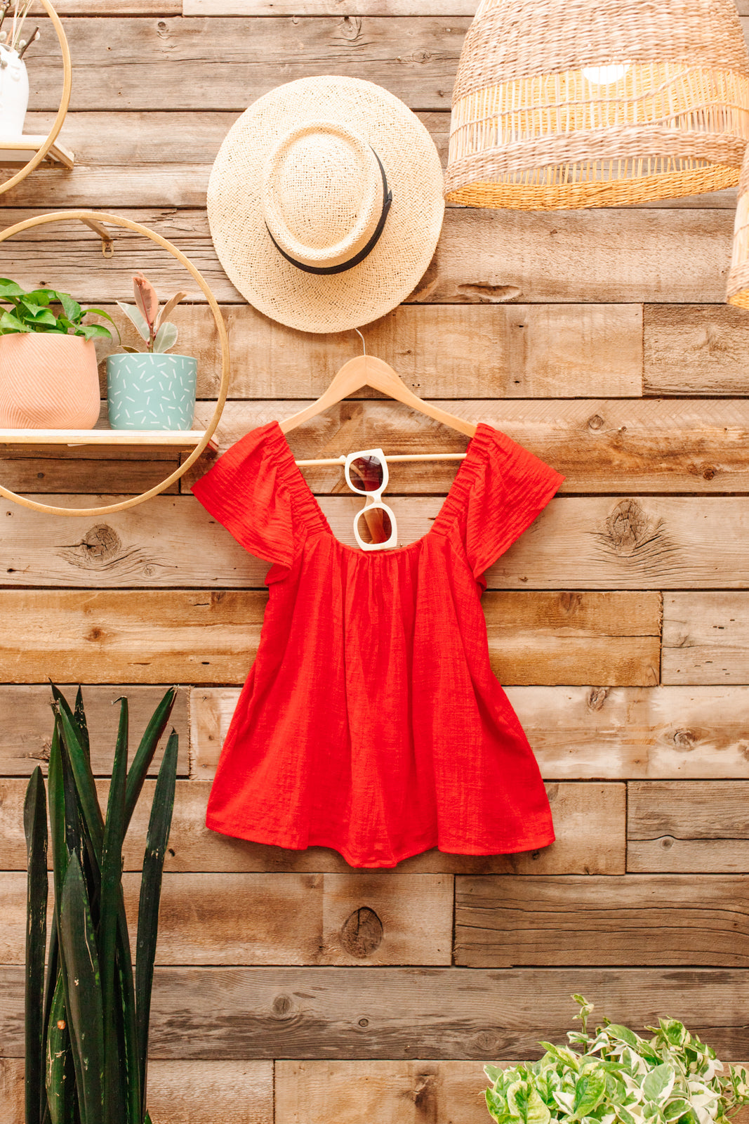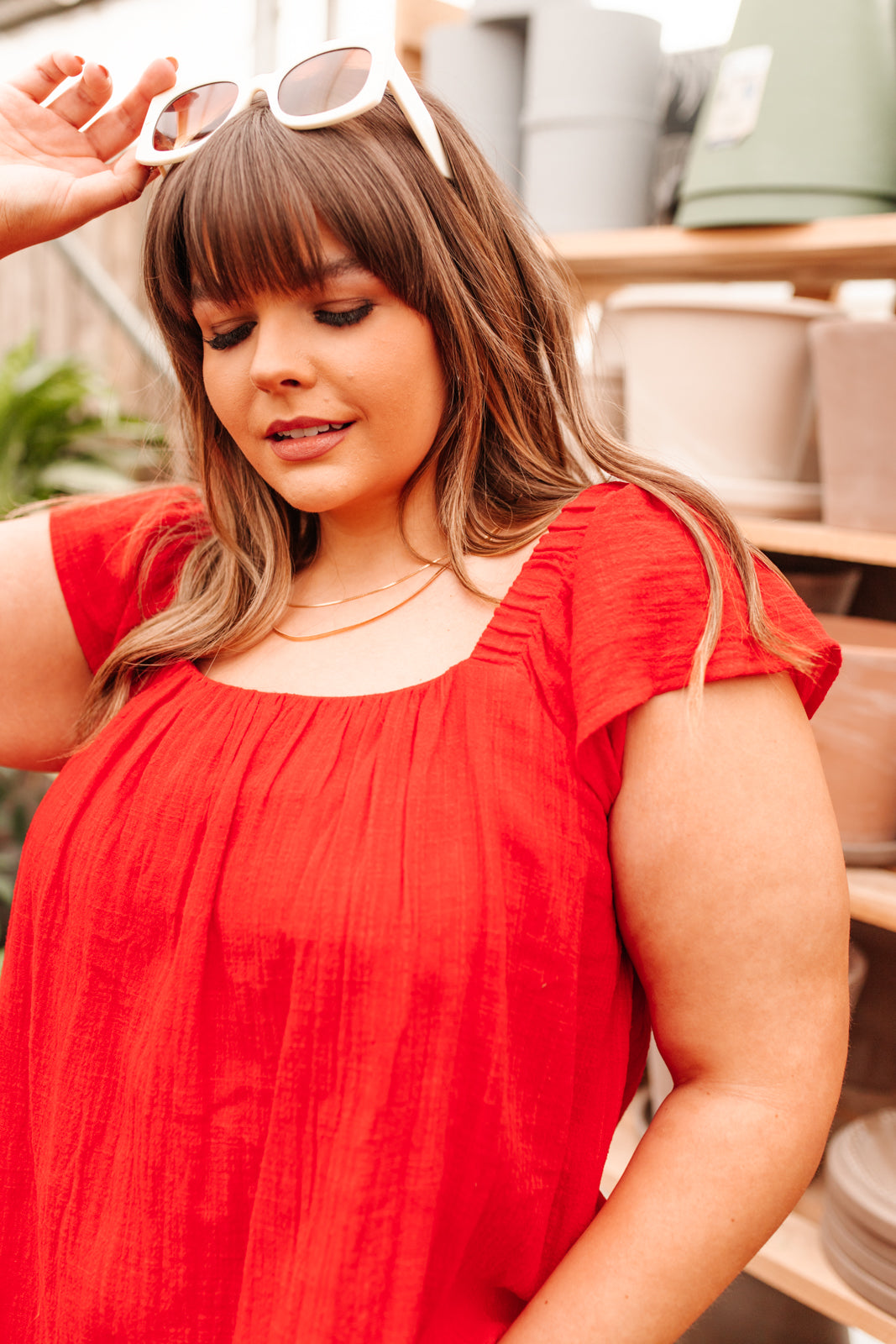 Start your day right with the Back Of My Mind Top! This adorable red top features flutter sleeves with elastic detail, square neckline, and a-line silhouette. Pair this lightweight gauzy top with white denim, and sandals for a cute summer look!