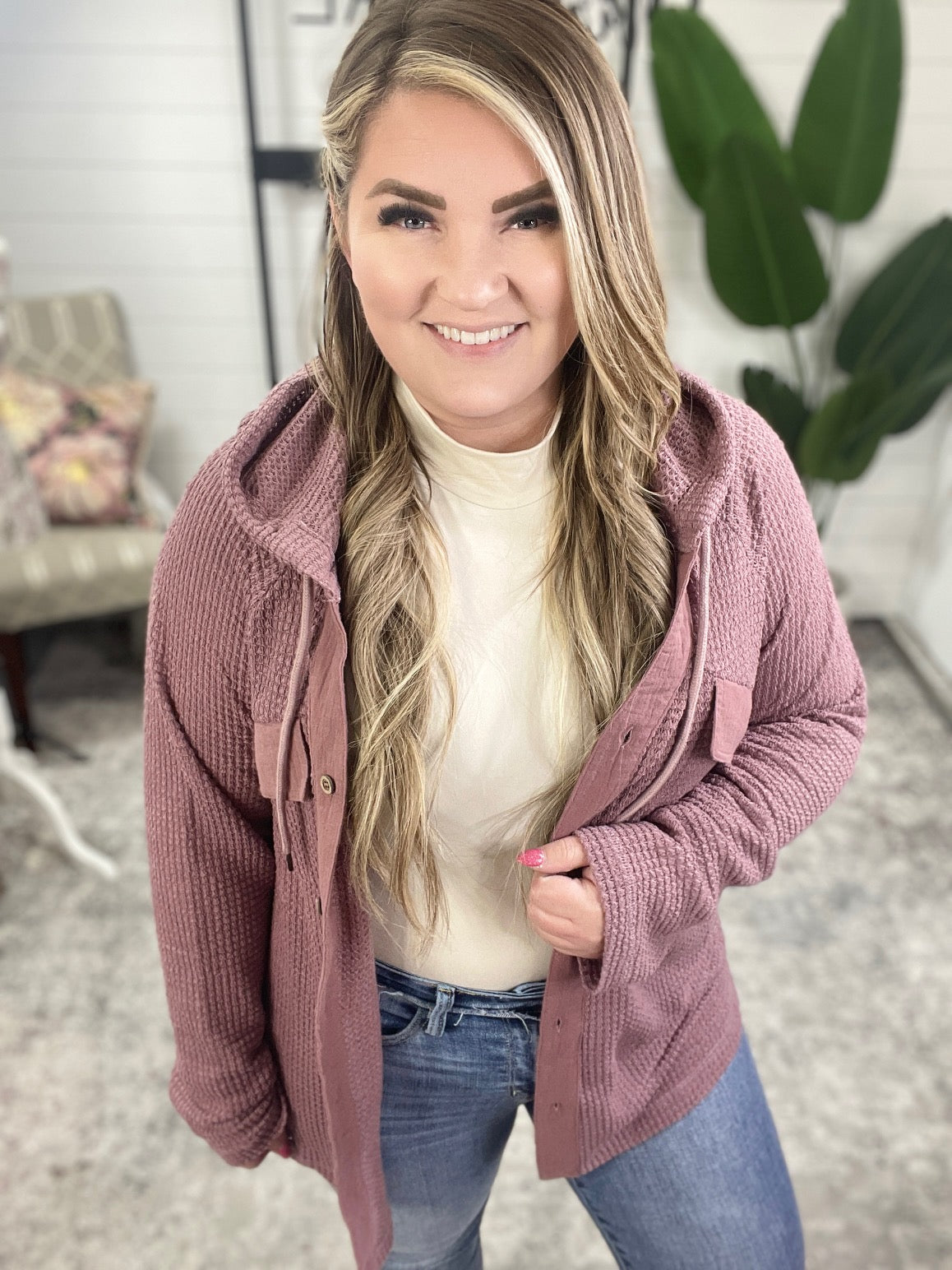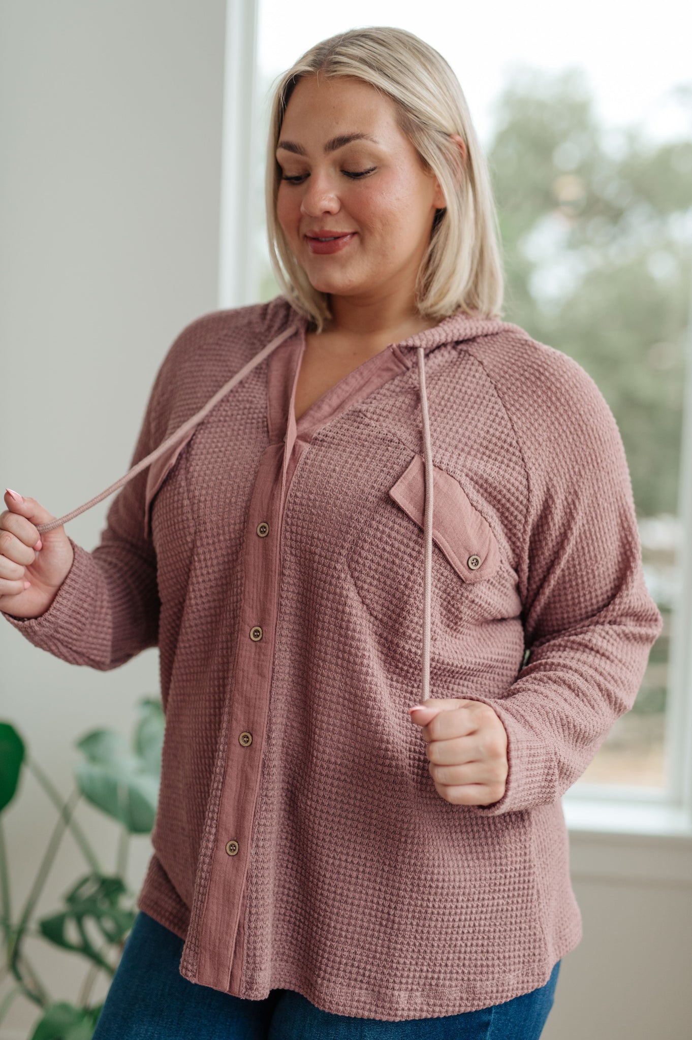 This Best Case Scenario Hooded Pullover is designed for easy comfort. Crafted with a waffle knit fabric adorned with a button front and generous hood, you can take on your day with warmth and style.