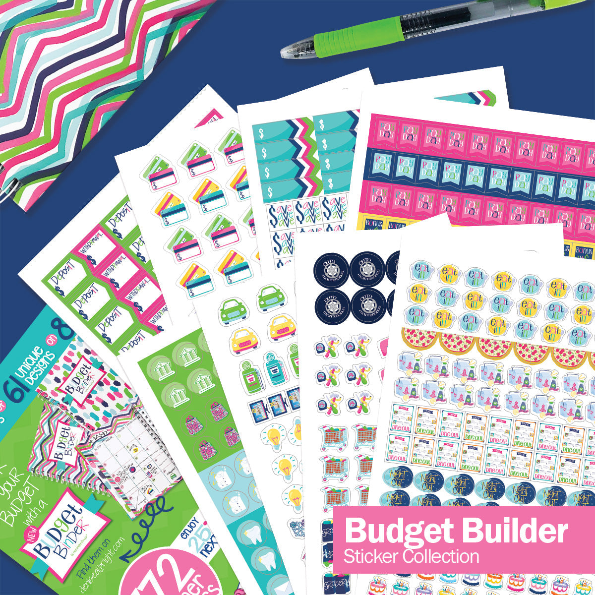 - Budget Builder (772 stickers) - Build your budget with these bright & colorful stickers including designs like "No Spend Zone," Dollar Bills, Take Out, Coffee, "Pay Day," Piggy Bank, Credit Cards, "Donate," Shopping Cart, "Pay Bills," Pizza, Take Out & so much more!