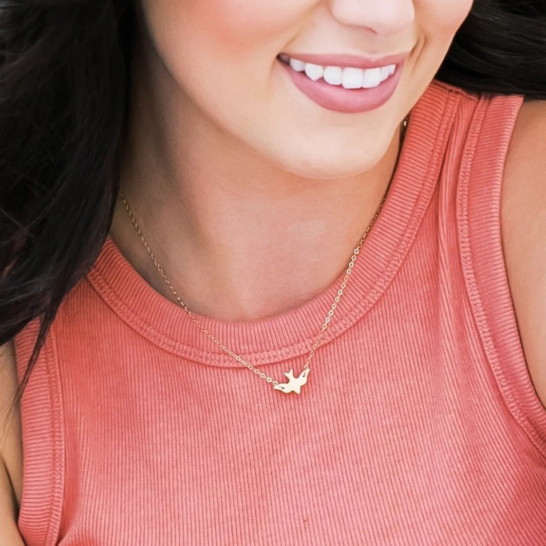 Our dainty soaring bird charm in your choice of Sterling Silver, 14k Gold Fill, or 14k Rose Gold Fill on a matching 18" chain. Beautiful, simple and perfect for layering!