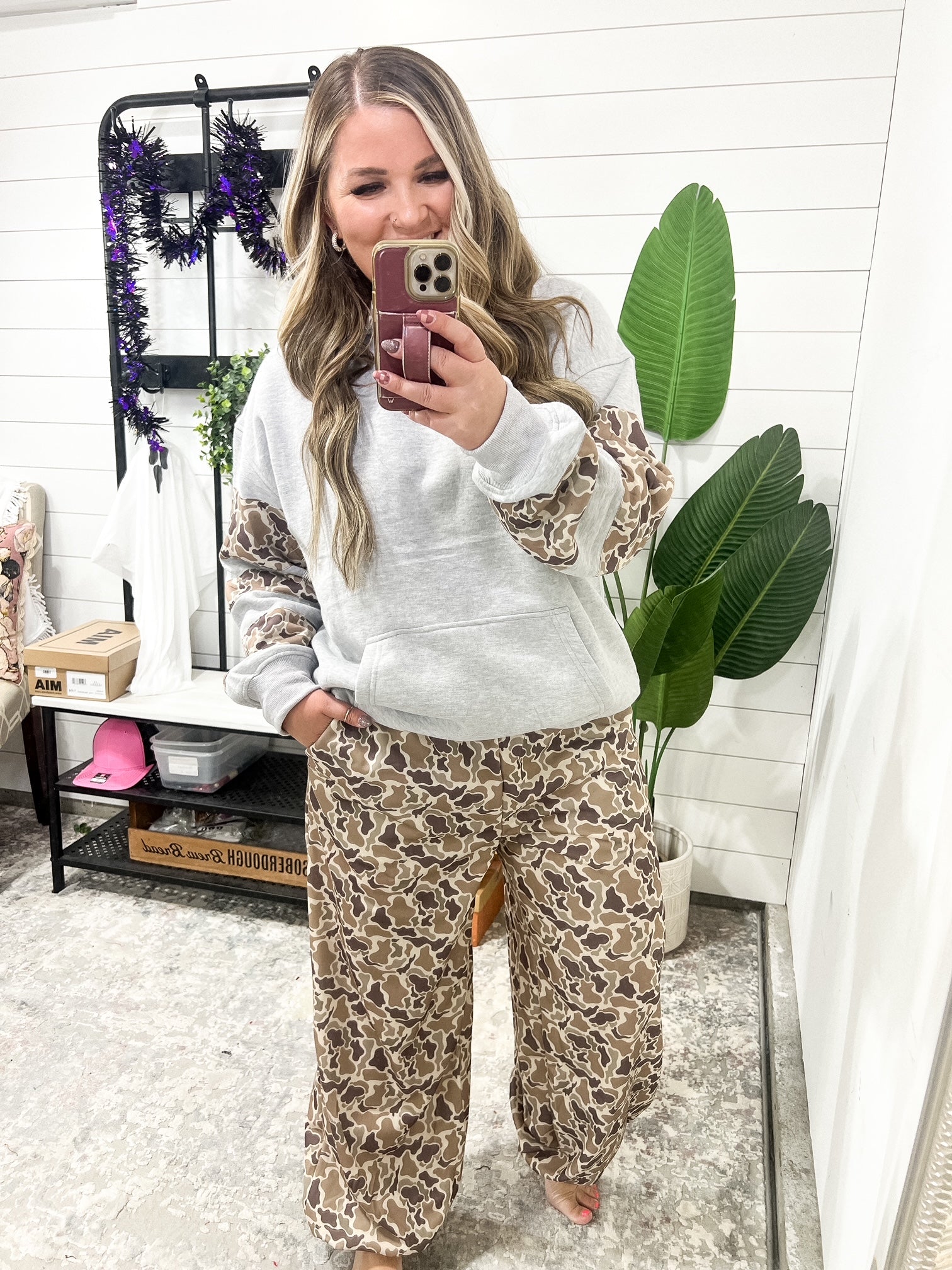 The Game Plan Hoodie is where sporty meets street-style cool. This heather grey hoodie features bold camo patched sleeves for a fun, elevated twist. It’s soft, cozy, and made for everyday wear—whether you're hitting the stands, the store, or the sofa.