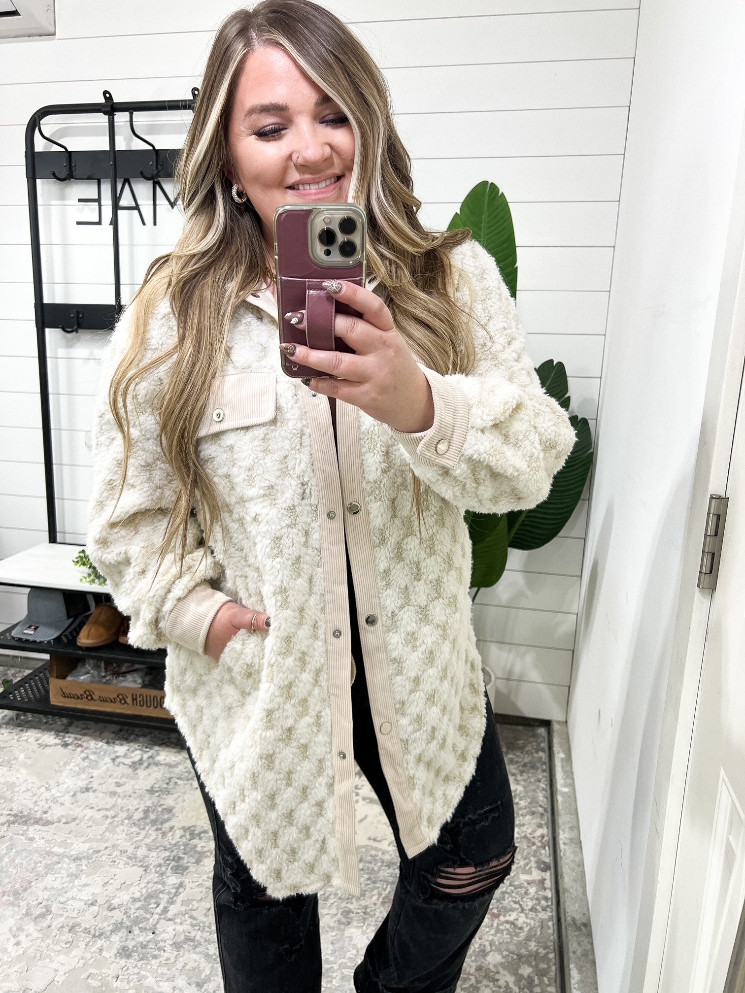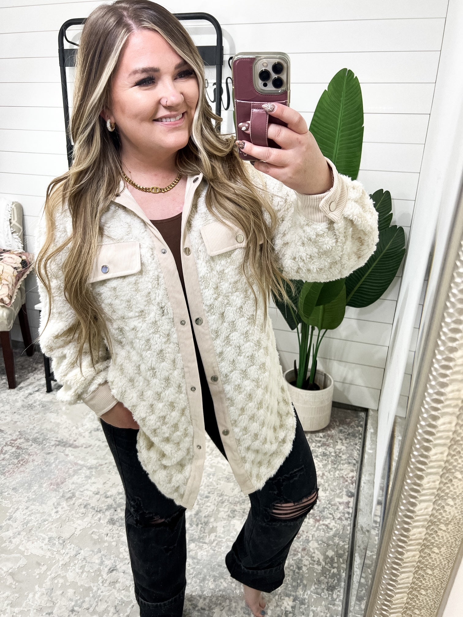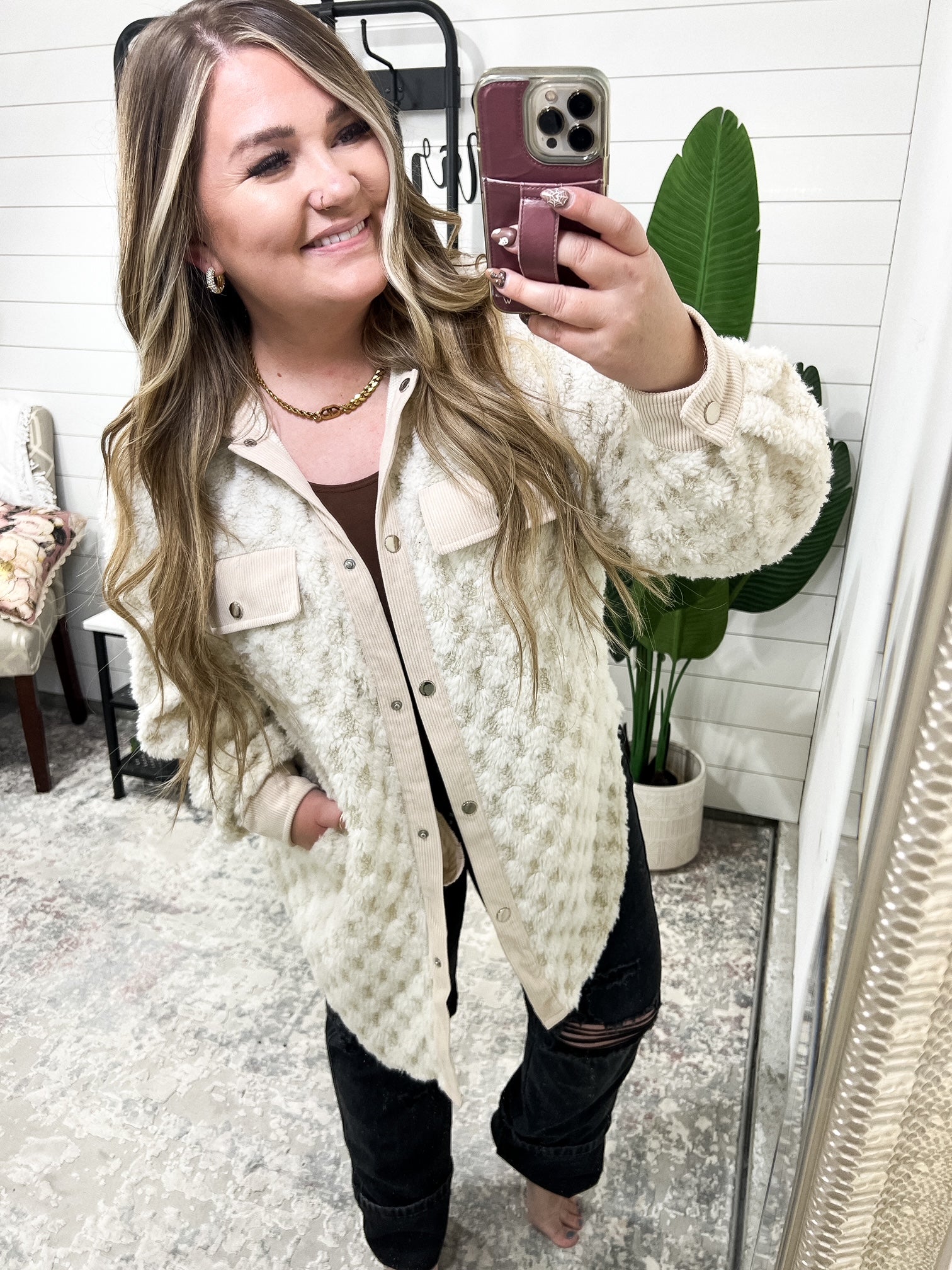 Model Lexi is a true medium top and prefers a Large in all of her shackets/jackets- she is wearing a large here!
