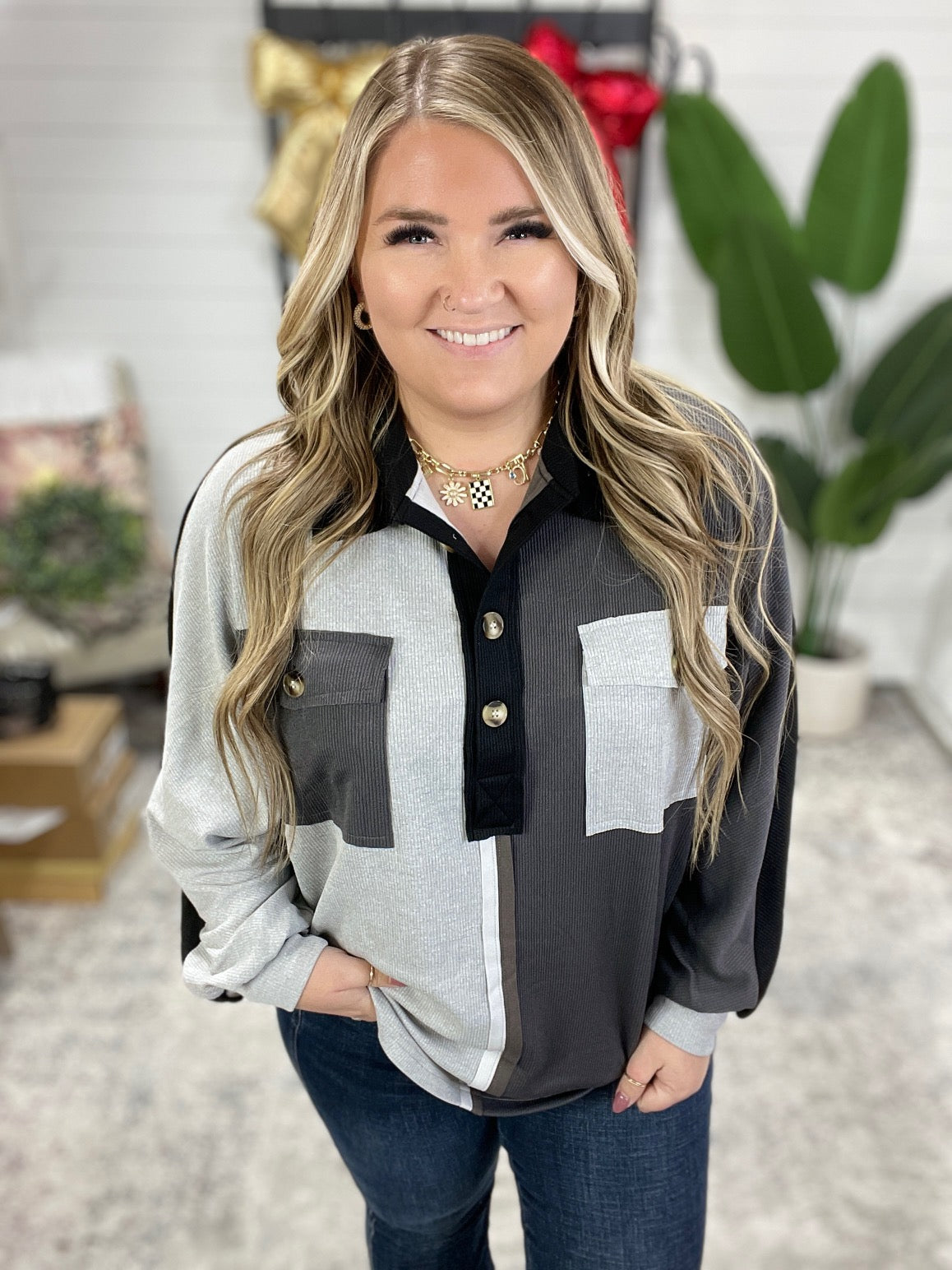Get ready to mix and match with our Chip Off the Old Colorblock V-Neck Henley! This eye-catching top features a ribbed knit texture, collared neckline, and dolman sleeves for an effortlessly stylish look. The half front button closure and functional chest patch pockets add practicality while the banded sleeve cuffs add a touch of flair. Perfect for any occasion, this top will become your new go-to!