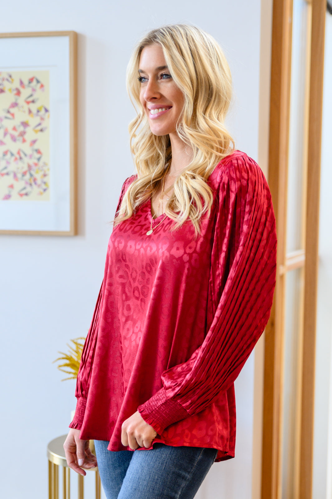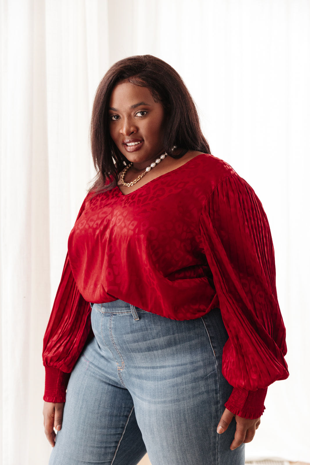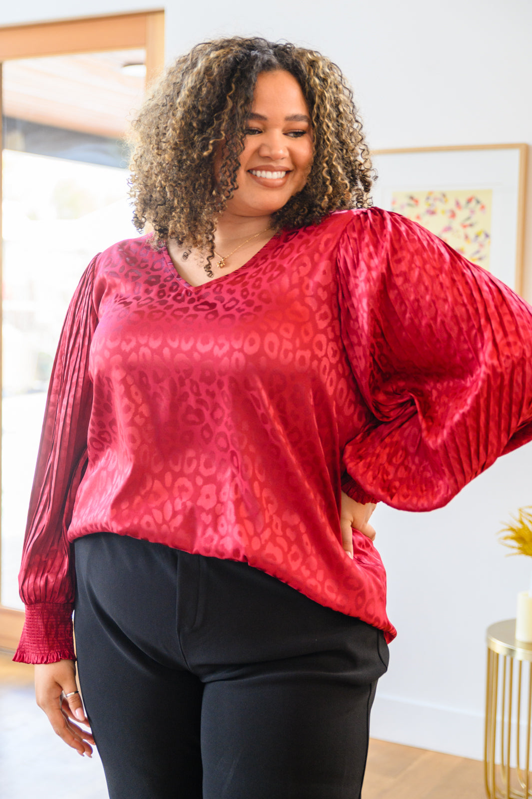 This romantic and chic top is absolutely stunning. It is in the most rich burgundy color, embossed with a subtle animal print that we know you'll fall in love with. An amazing pleated balloon sleeve with ruched cuffs and a slight v-neck shape this shirt. Pair it with jeans and heels or style with a mini skirt for the perfect date night outfit!