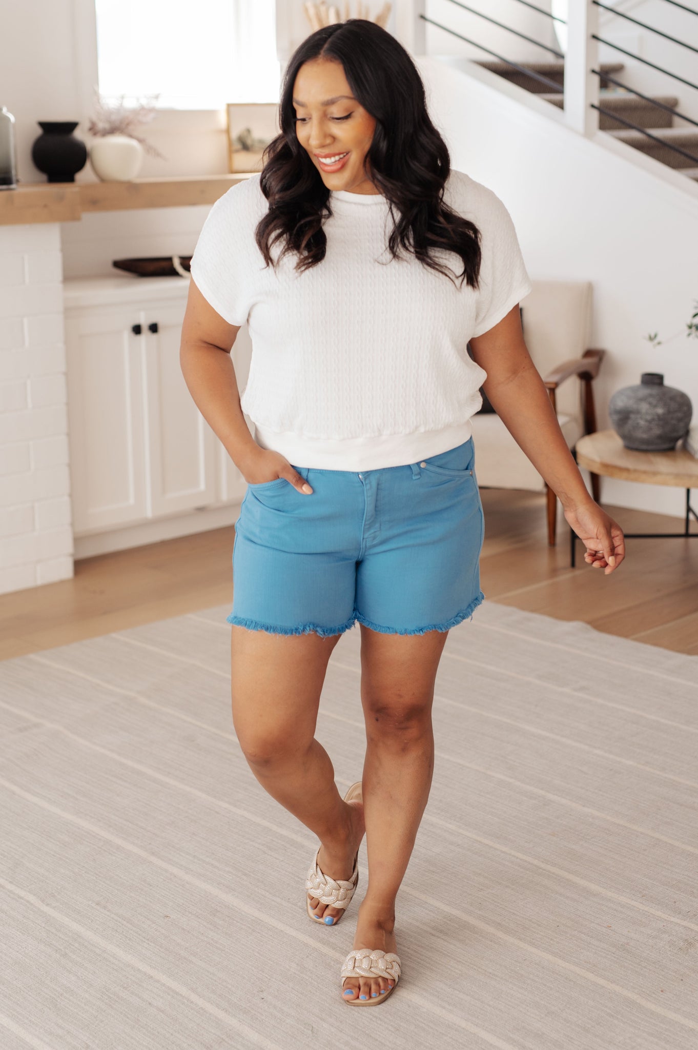 • Celeste Mid Rise Shield Pocket Cutoff Shorts in Sky Blue