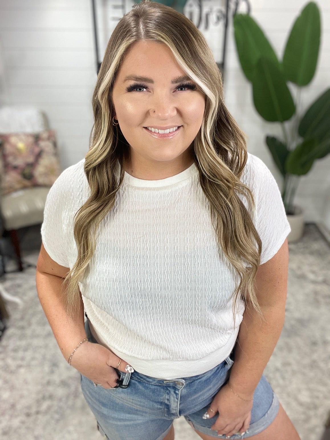Get ready to rock a classic look with the Clearly Classic Short Sleeve Top! The cable knit fabric adds texture and interest, while the ribbed neckline and banded hem provide a modern twist. With batwing sleeves and an exaggerated ribbed hemline, you'll stand out in style.
