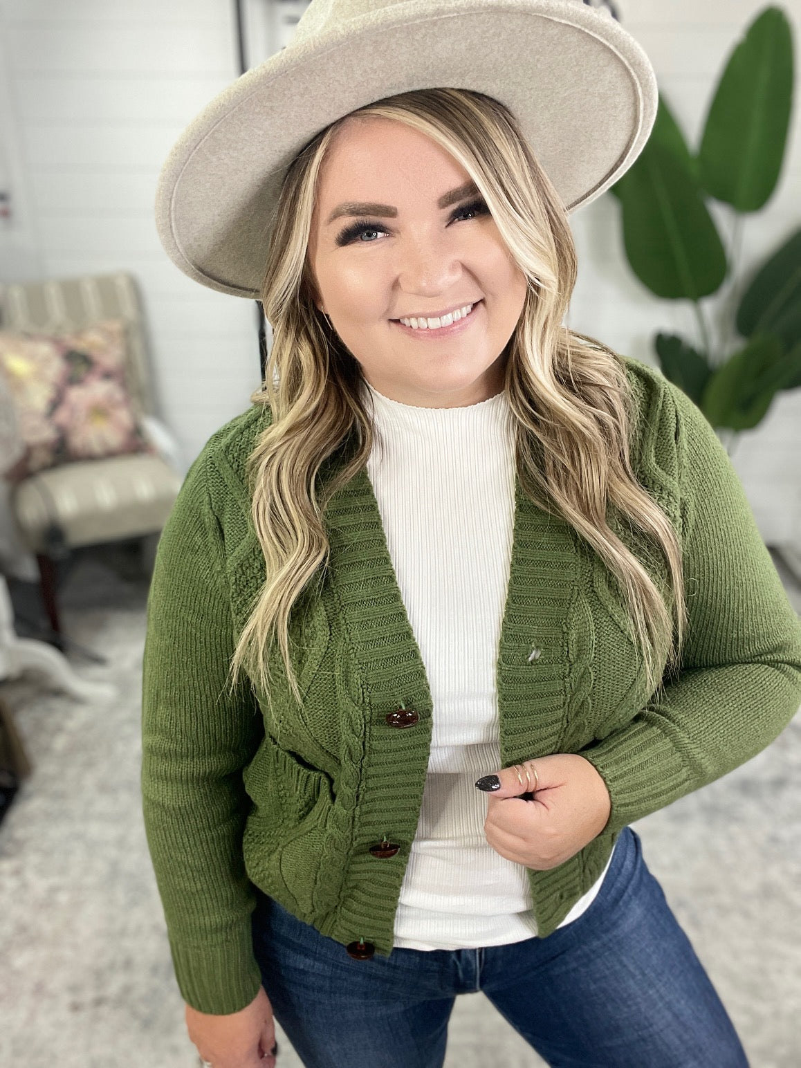 Be ready for the day with this Climbing Vine Cable Knit Cardigan in Green. With its slim fit, v-neckline, and cable-knit pattern, it's sure to become your favorite cozy choice. Its nostalgic collegiate style and patch pockets round out the classic design. Experience comfort and timeless style like no other with this cardigan!