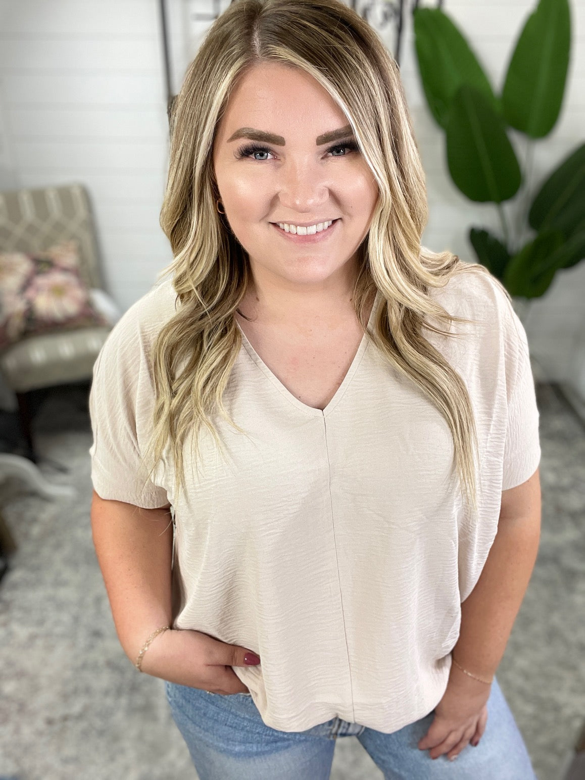 Crinkle Woven V-Neck Dolman Sleeve Top in Sand Beige