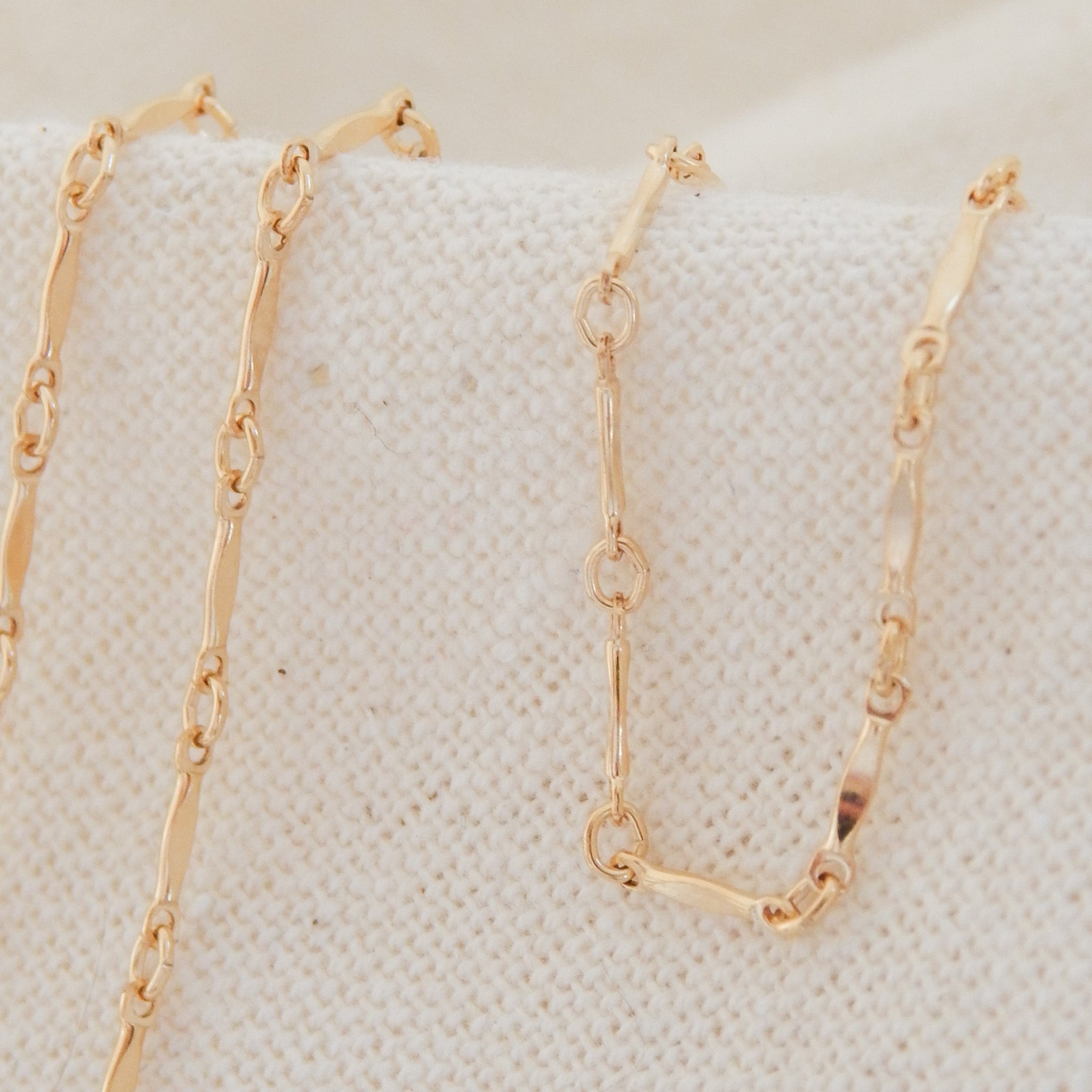 Dainty, 16" bar link necklace in your choice of Sterling Silver, 14k Gold Fill, or 14k Rose Gold Fill with matching lobster clasp and built-in 2" extender. Wearable anywhere from 16"-18". Perfect for layering or on its own!