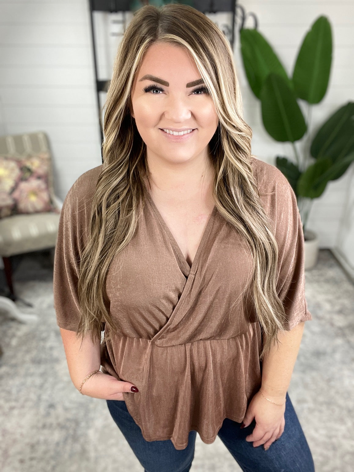 Meet the Dazzlingly Draped V-Neck Blouse! This elevated peplum style is constructed from a gorgeous shimmering bronze fabrication, a surplice front forms the flattering V-neckline. The cased elastic waistband gathers in to create a playful peplum silhouette. Pair with your favorites mini skirt or a pair of denim trousers, this blouse is easy to take from day to night.