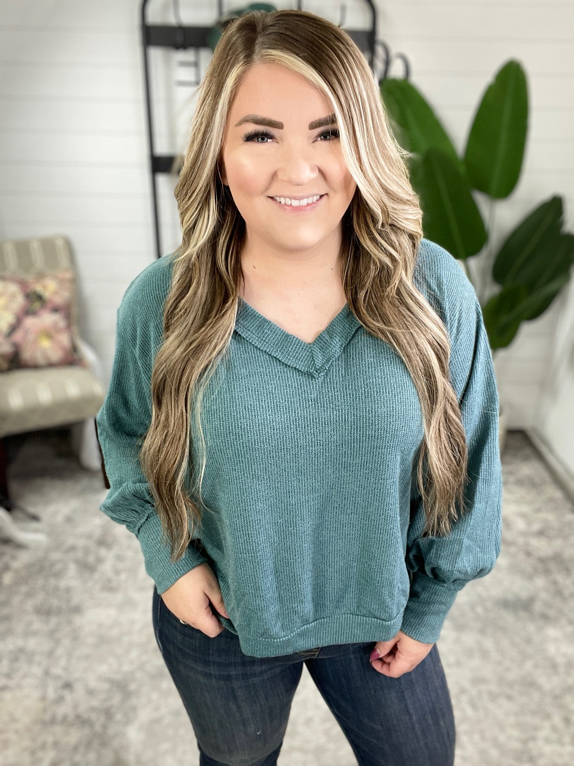 Look stunning in this trendy and comfy Doesn't Compare Top made from a soft, brushed marble knit fabric. This V-neck top features raw edge details, dropped shoulder and balloon sleeves for a unique look. Perfect for day-to-night wear!