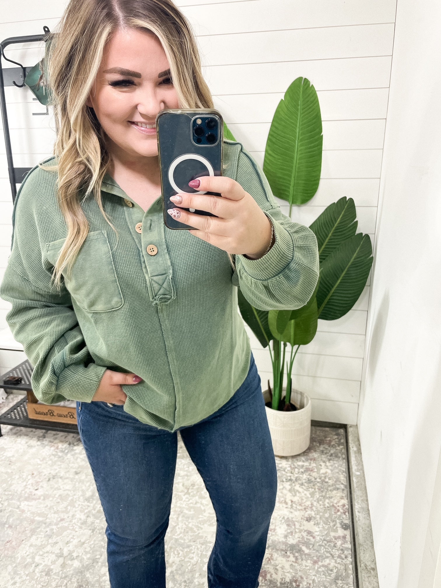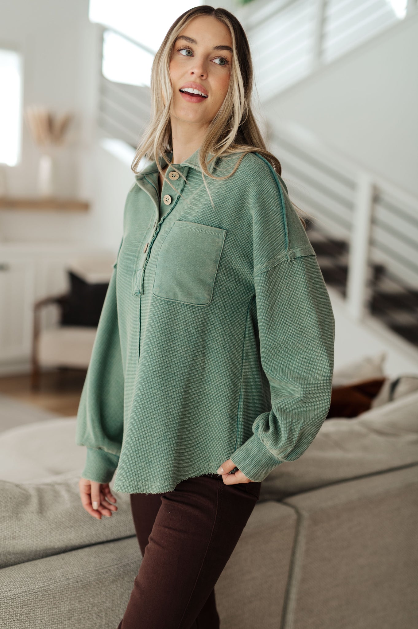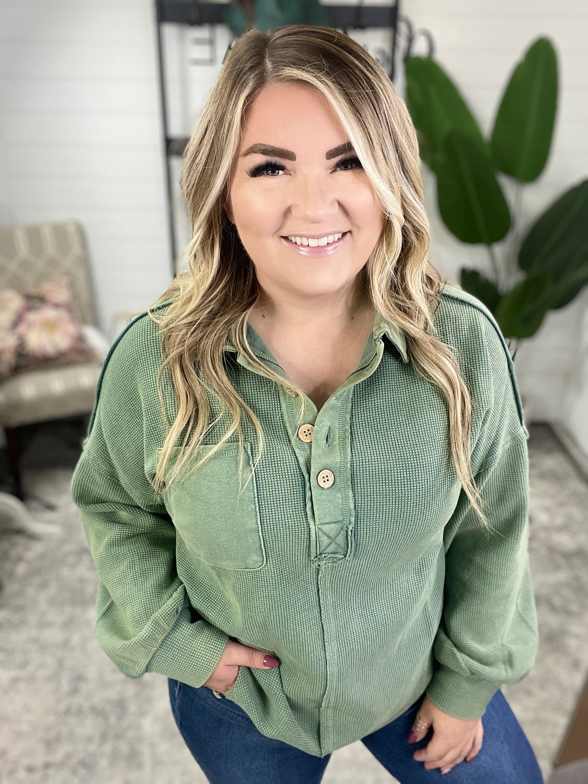 This Don't Stop The Beat Collared Pullover is the perfect combination of style and comfort. It features soft, waffle knit fabric, a collared neckline, jersey knit contrast, and mineral wash for an effortless, lived-in look. It's finished with wooden buttons, for a touch of charm, plus it's super comfortable, so you can look and feel your best all day long.