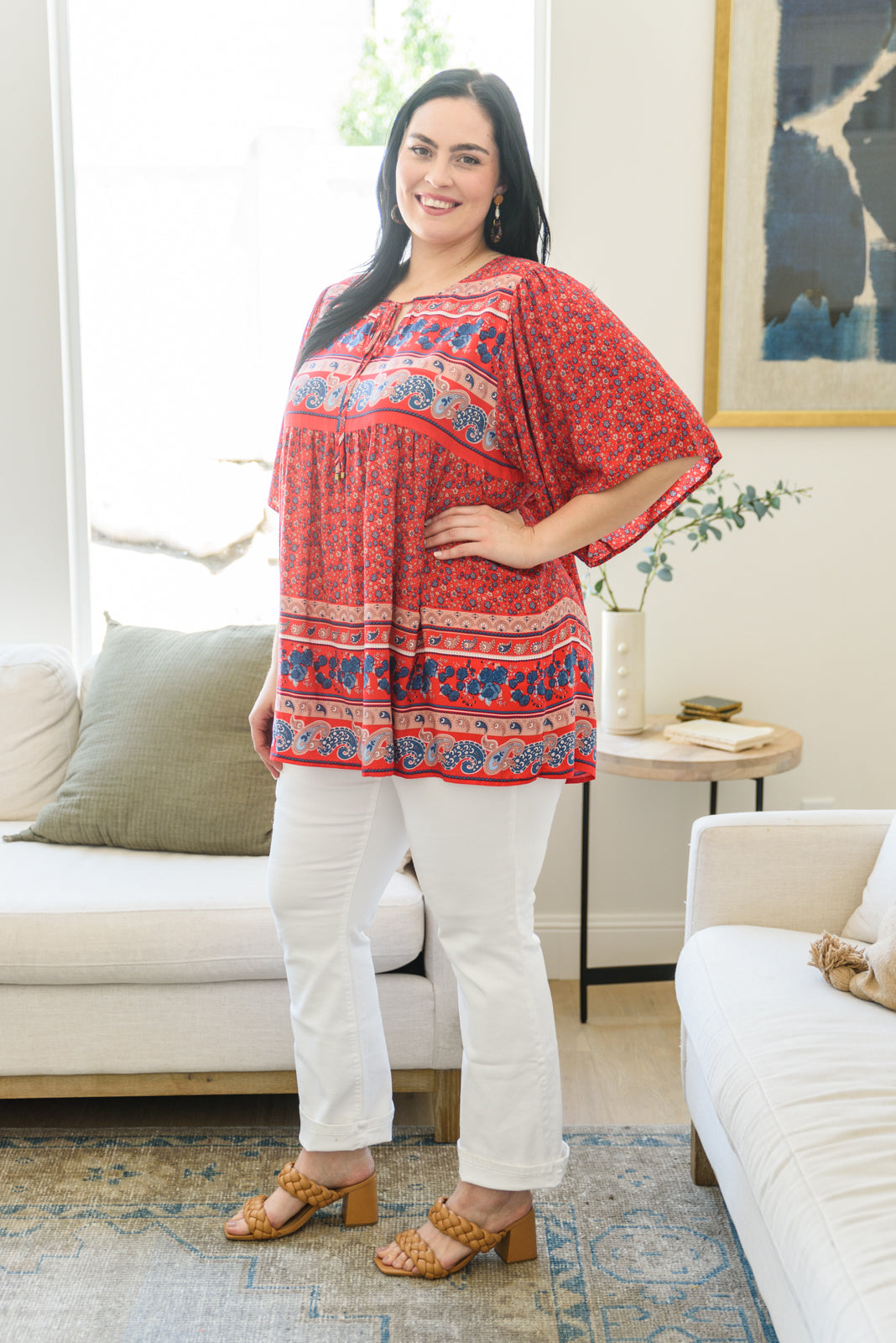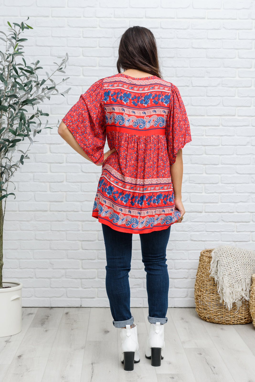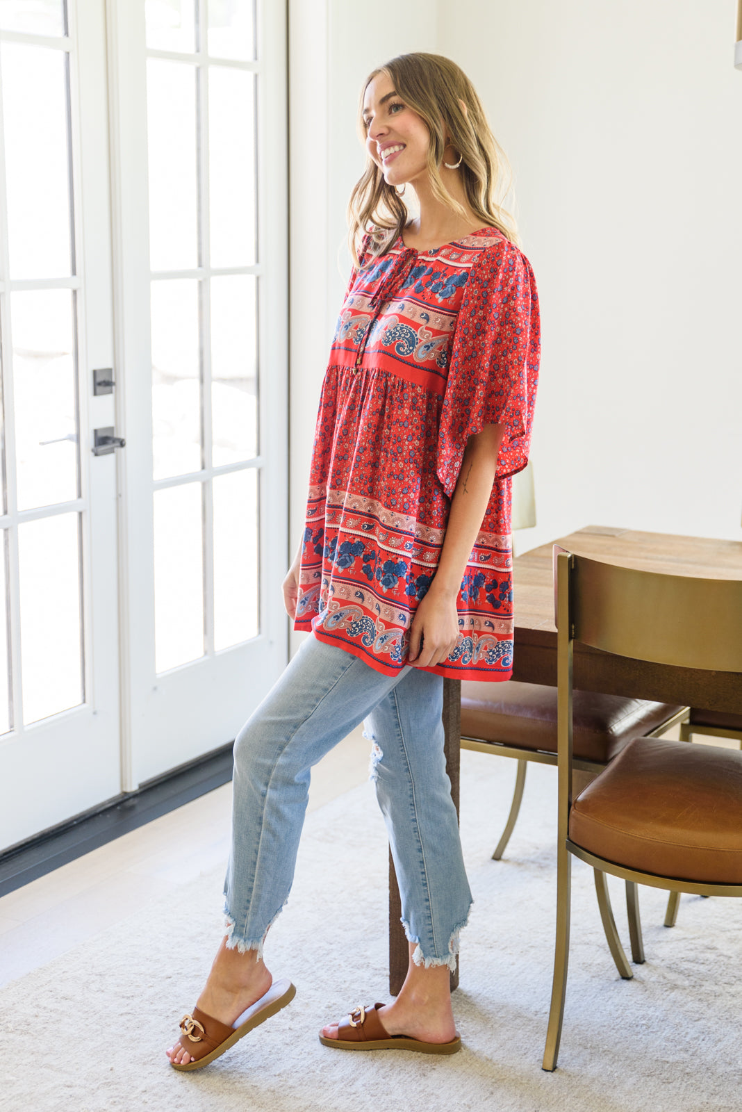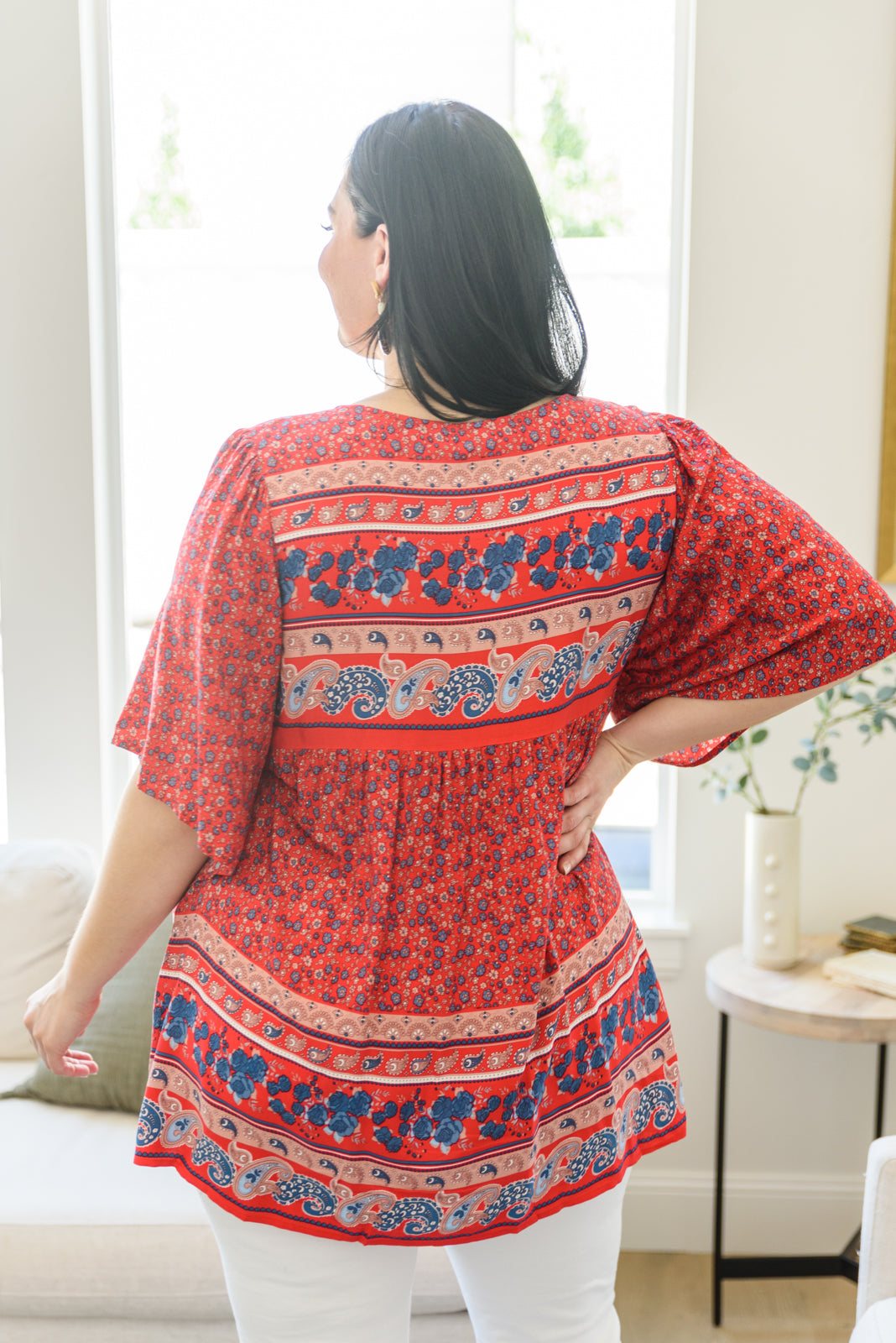 Keywords: Boho, Red, Bell Sleeves, Paisley, Floral, Top