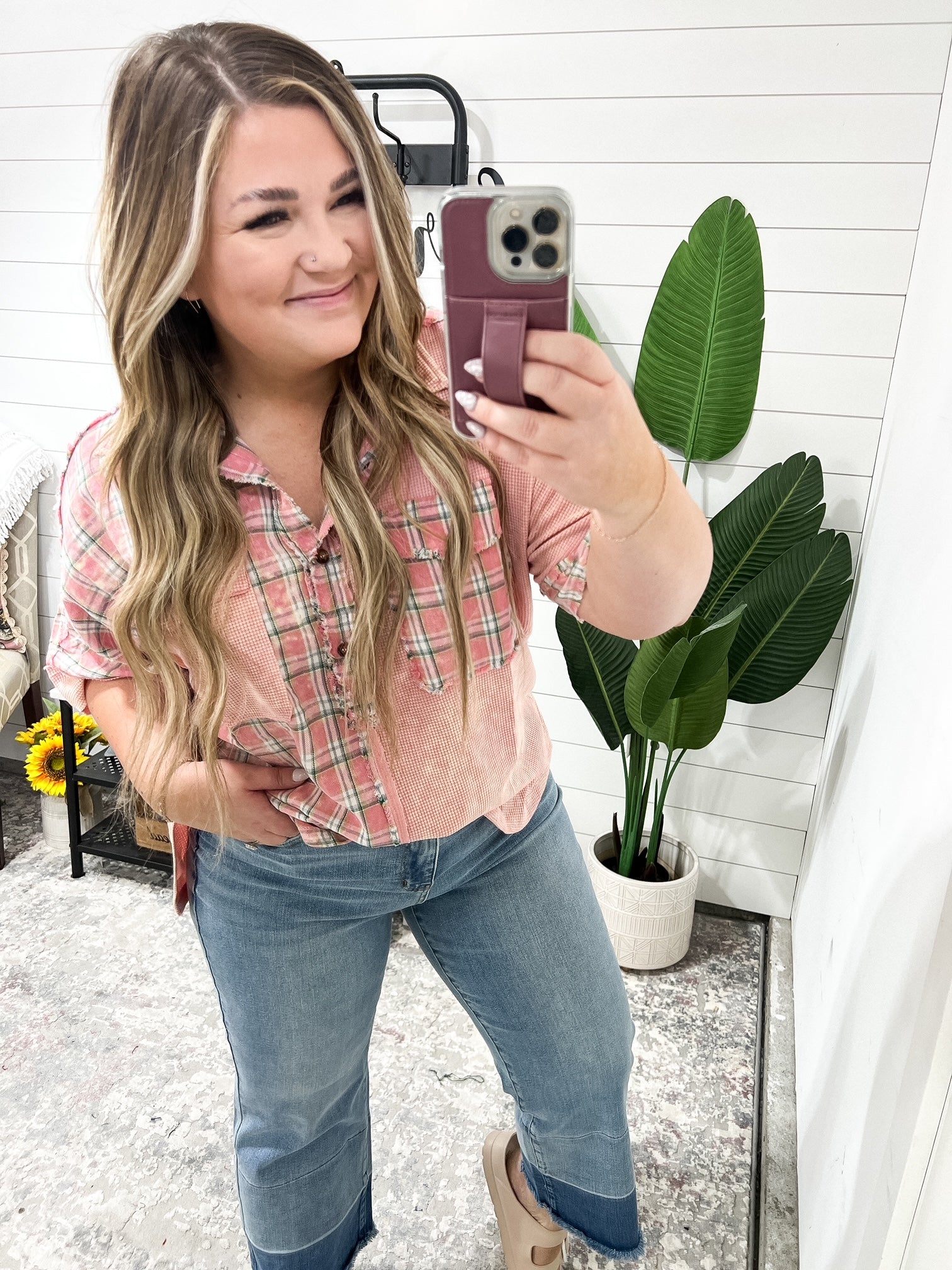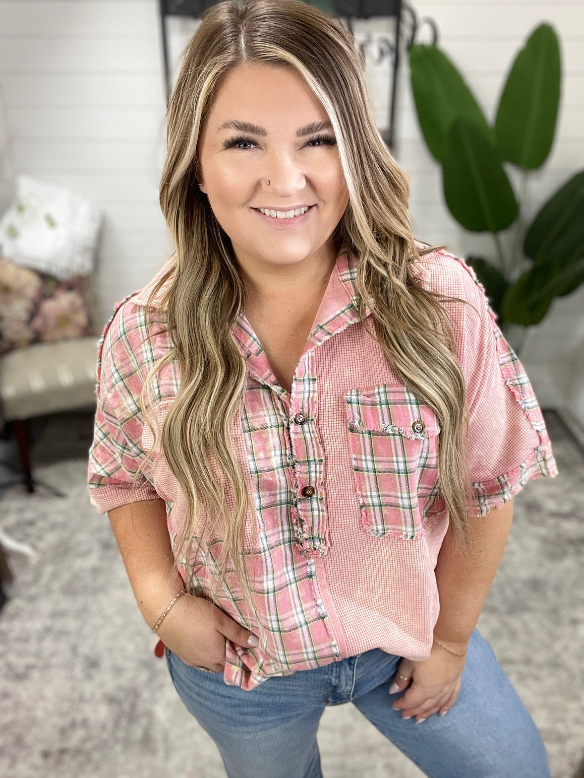 Introducing our Easy to Please Plaid Color Block Top! This top features a cozy waffle knit with unique flannel accents. The half button closures and patch pockets add a touch of functionality, while the dolman sleeve and banded sleeve cuff add a stylish touch. Finished with exposed seams, it's the perfect top for anyone looking to add a little quirkiness to their wardrobe.
