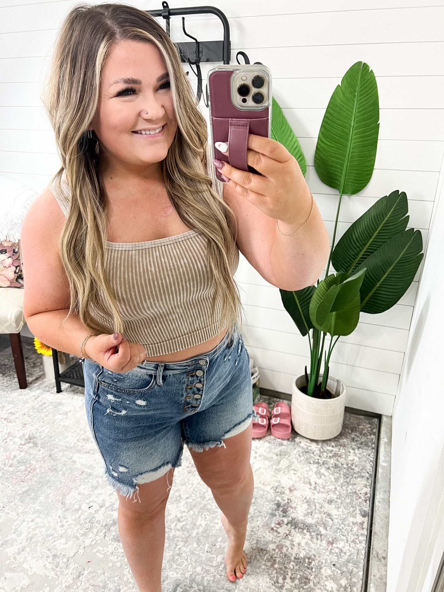This Effortless Reversible Mineral Wash Ribbed Tank is perfect for those who value versatility and comfort. The unique mineral washed ribbed knit material is super stretchy and can be worn with either a scoop neckline or v-neckline. Whether used as a base layer or standalone piece, this tank is a must-have for any wardrobe.
