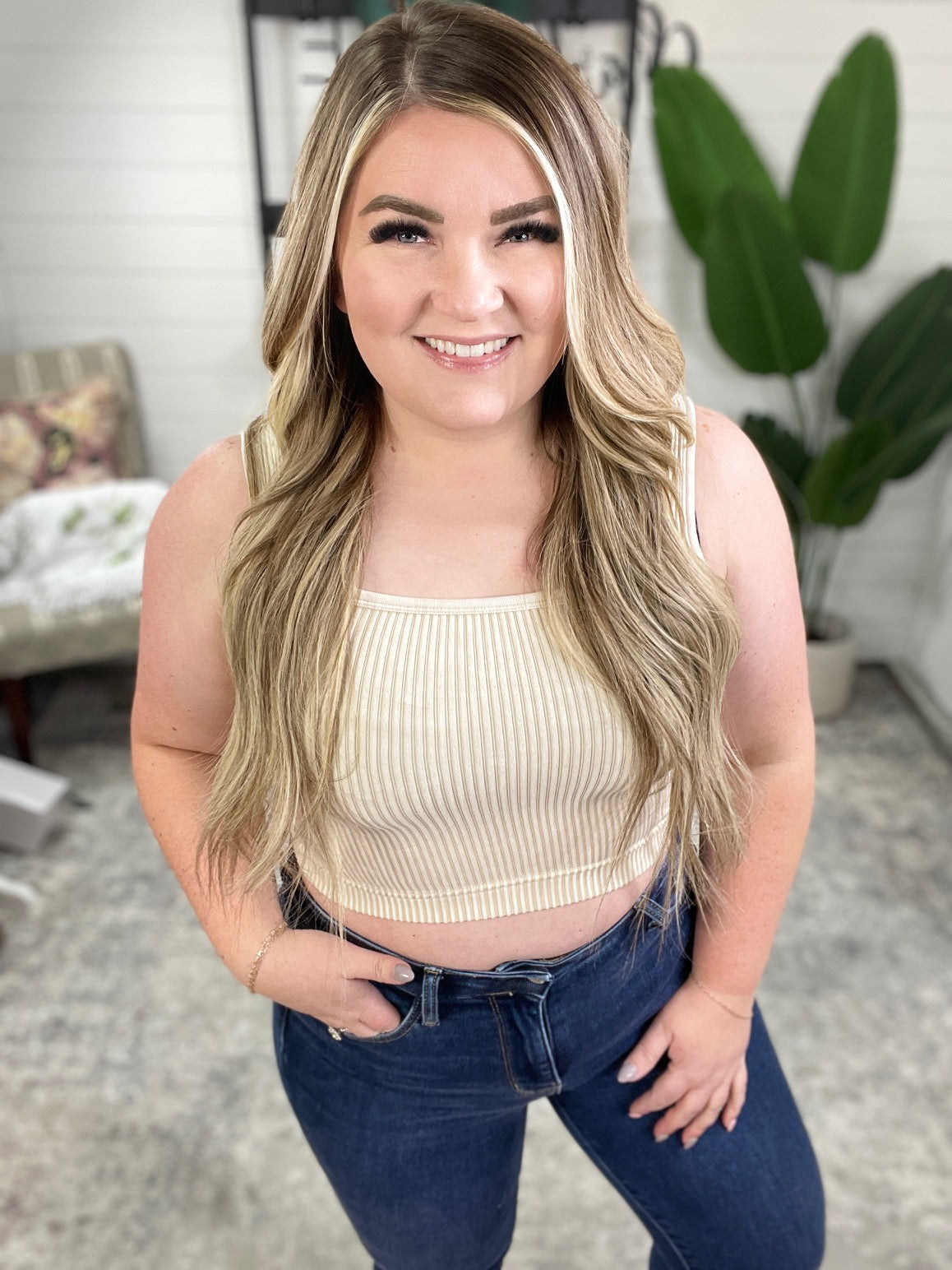 This Effortless Reversible Mineral Wash Ribbed Tank is perfect for those who value versatility and comfort. The unique mineral washed ribbed knit material is super stretchy and can be worn with either a scoop neckline or v-neckline. Whether used as a base layer or standalone piece, this tank is a must-have for any wardrobe.