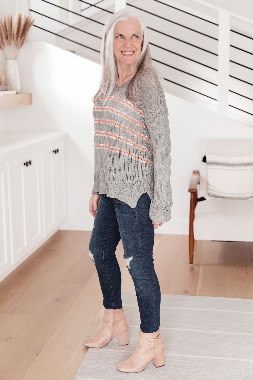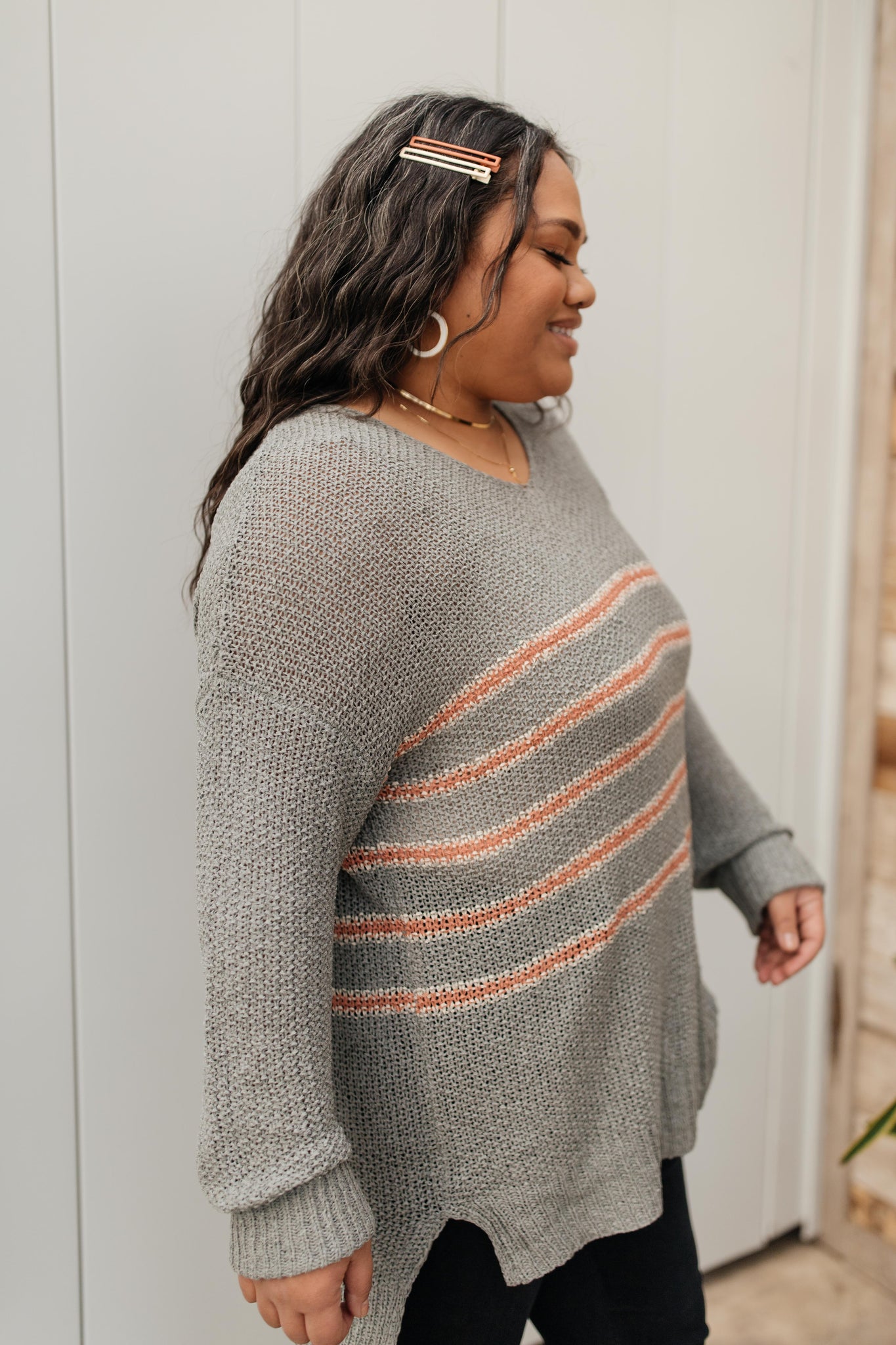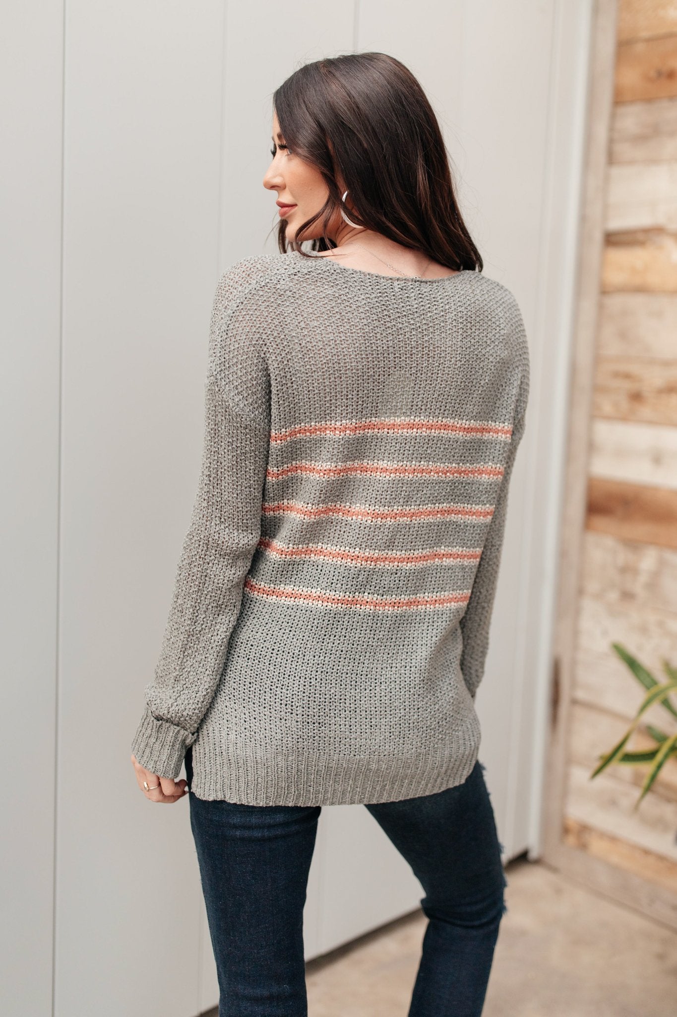 The Eliza Striped Sweater is chic and downright pretty! It features lovely peach stripes on a sage open-knit canvas, and it's so lightweight with some stretch to it. It's a perfect transitional piece for all you sweater lovers out there.
