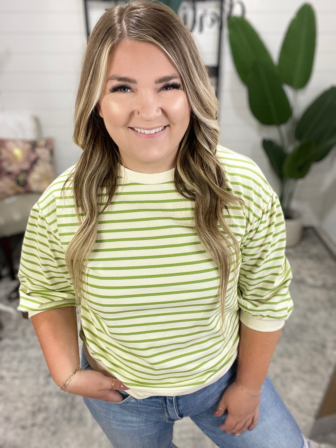 Add a playful touch to your wardrobe with our Enrichment Time Striped Top! Made with midweight sweater knit for a high-stretch, comfortable fit. Featuring a round, ribbed neckline, balloon sleeve, and exaggerated ribbed hem. Perfect for a quirky and fun look.