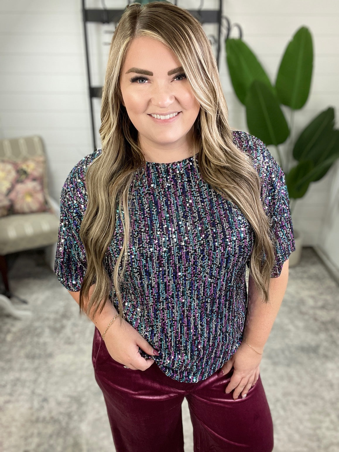 This beautiful Evening of Stars Sequin Top will shine all night with its sequin mesh and relaxed fit. Sparkle your way through the night with its round neckline, dropped shoulders and raw hem. Fully lined for extra comfort.