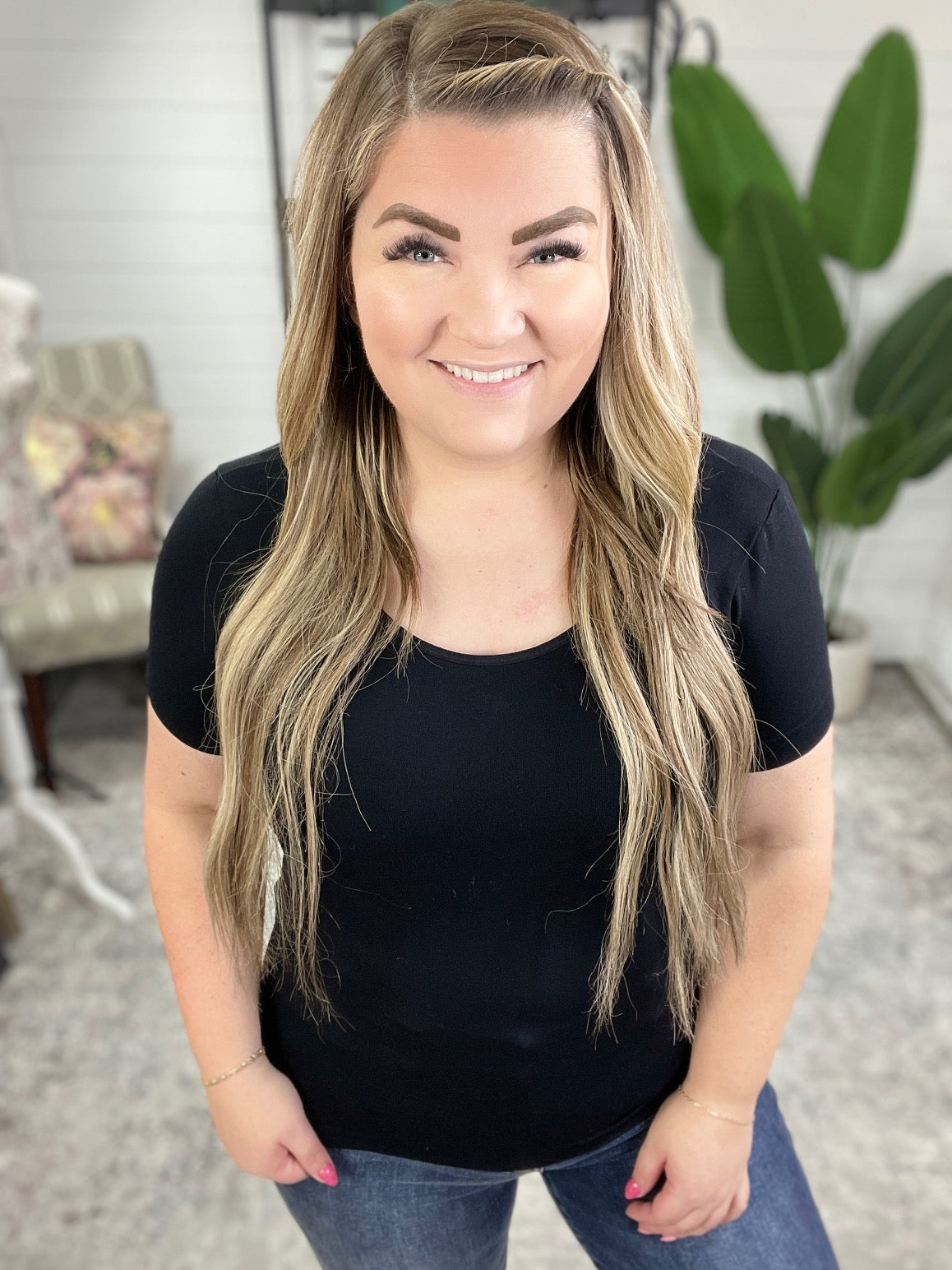 The Everyday Scoop Neck Short Sleeve Top is the perfect sleek and fitted base for any look. It fits like a glove with its super-stretchy, fitted silhouette that will keep you confident and comfortable all day long. This flattering top features a reversible scoop neckline or v-neckline and short sleeves, so you can move with ease, makes it an effortless pick for any occasion. Upgrade you wardrobe today with this must have staple!