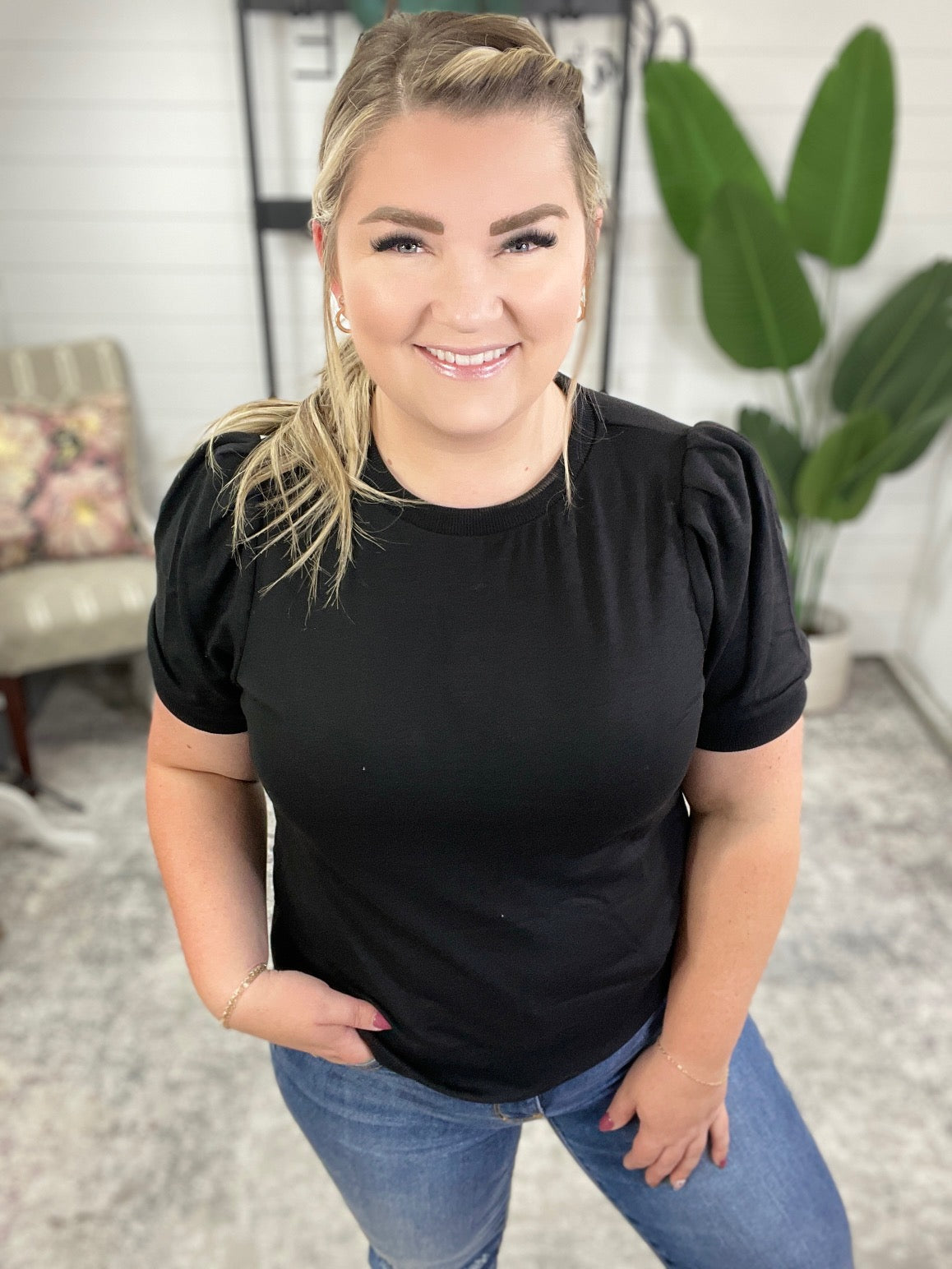 This Evidently Different Puff Sleeve Top brings stylish comfort with its soft french terry knit and relaxed fit. The puff half sleeves give it a modern, playful feel, making it a versatile piece for any wardrobe. Perfect for mixing and matching, it's an easy basic you'll love.
