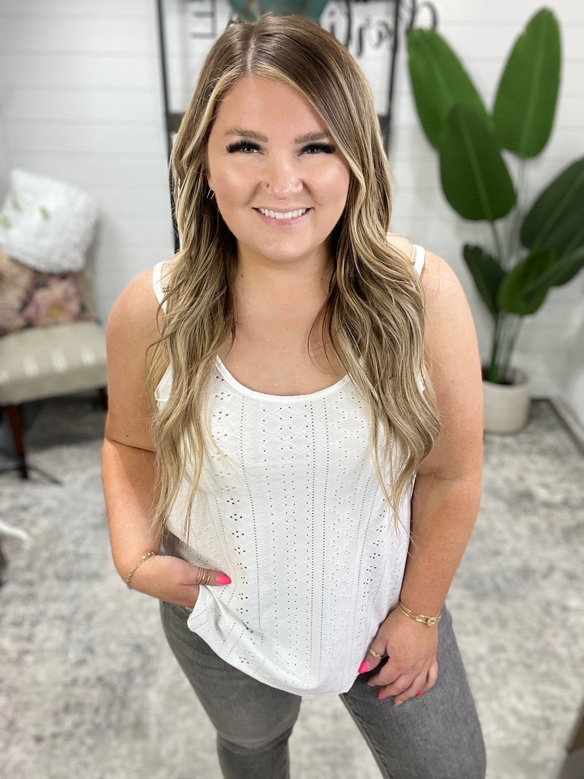This Eye on the Prize Eyelet tank will have you keeping your head in the game in style. With delicate eyelet lace, adjustable straps, and a scooped hem, this tank is both chic and practical. You can confidently rock this tank for any occasion.