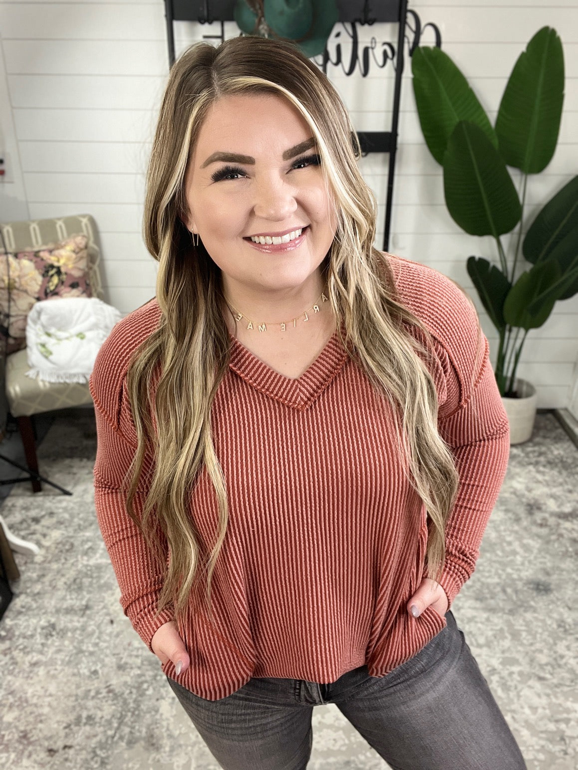 Get ready to fall in love with our First and Foremost Rib Knit Top! The ribbed knit fabric is oh-so-soft and perfect for cozying up in. The V-neckline and dropped shoulder add a touch of playfulness, while the exposed seams and banded sleeve cuff give it a unique edge. Plus, with pockets and a stepped hem with side slits, this top has it all! (No, seriously, it does.)