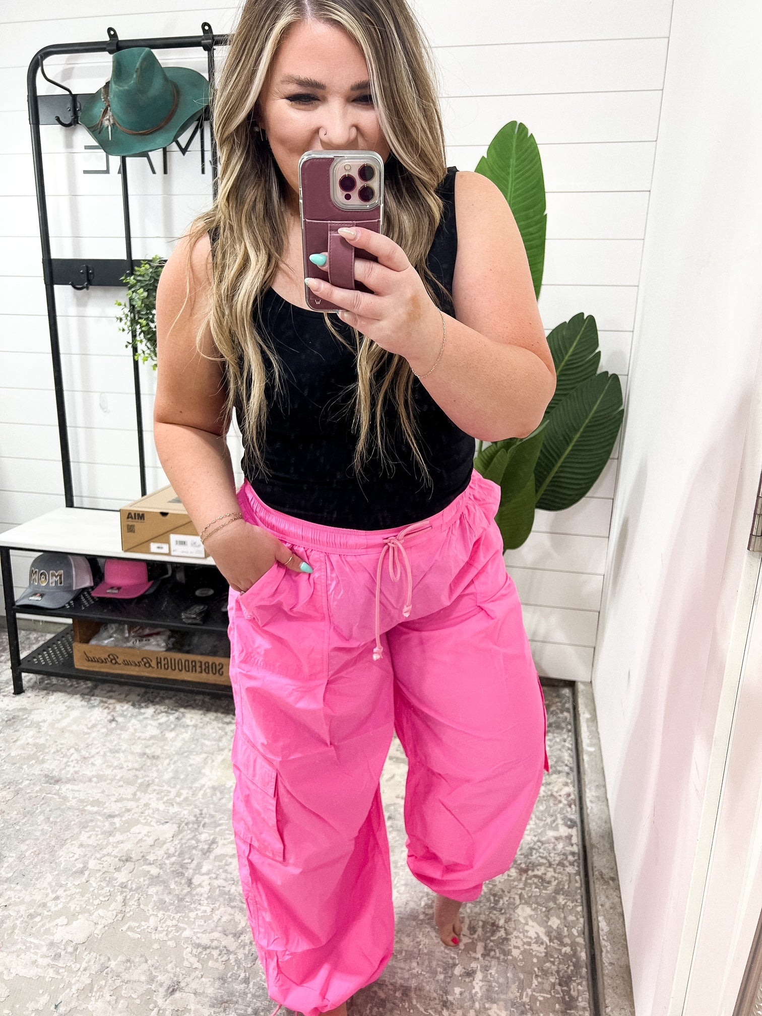 Be a fashion frontrunner in our First Place Cargo Pants! Made with windbreaker material for all-weather wear, these pants feature a functional drawstring, side and cargo pockets, and drawstrings at the cuffs. With added back pockets, you'll stay one step ahead while looking effortlessly cool.
