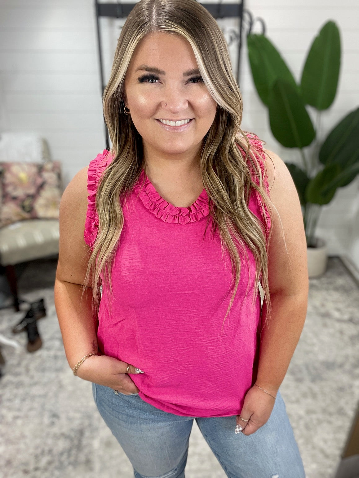 Add a pop of hot pink to your summer wardrobe with our Flourish and Flare Tank. The crinkle poly airflow material keeps you cool and comfortable, while the gathered ruffle neckline adds a touch of playful flair. Perfect for any occasion, this sleeveless tank is sure to make a statement!