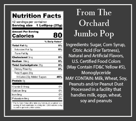 Open a From the Orchard Jumbo Pop Assortment and tantalize your tastebuds with the flavors from a bountiful harvest! With sweet and fruity Green Apple, Orange Cream, Cherry, and Peaches & Cream flavors, we know this is about to become one of your favorite Jumbo Pop assortments.