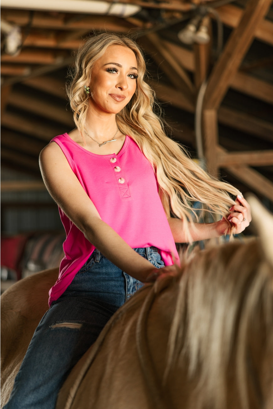 Stay comfortable and stylish in this terry tank top, featuring a subtle front button details for a touch of charm! The soft, breathable fabric offers a relaxed fit, perfect for casual days or layering. With its easygoing design and versatile style, this tank is a must have addition to your wardrobe this season! Stretchy, knit.