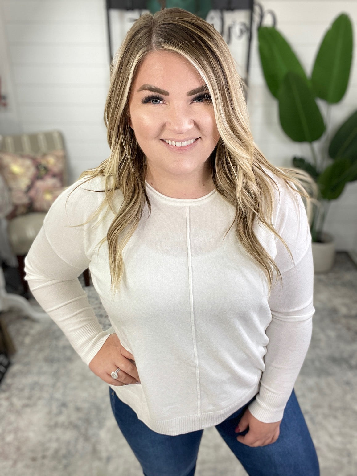 Front Seam Round Neck Sweater in Ivory