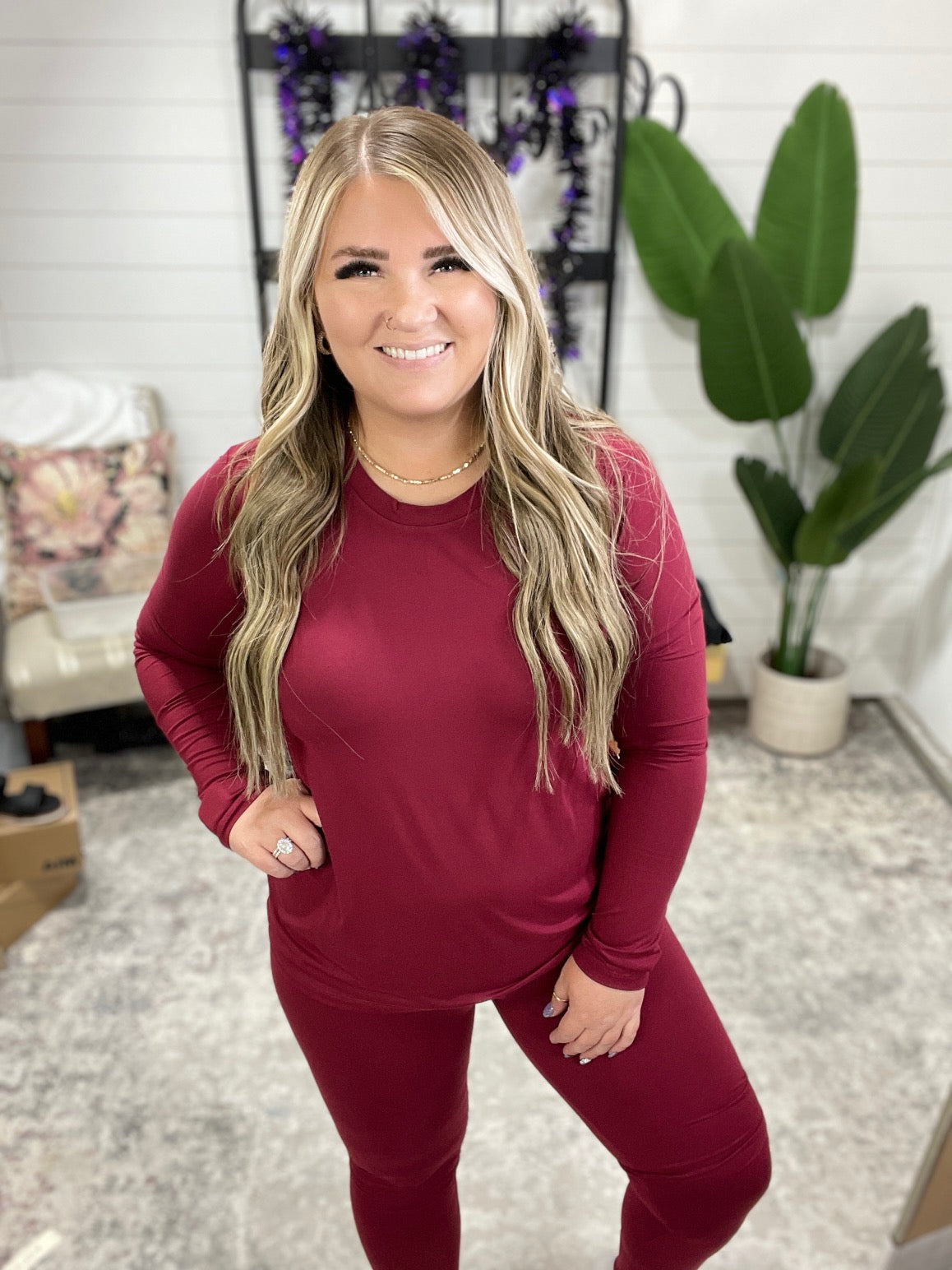 Wrap yourself in the ultimate comfort with the Get Me Cozy Set. Crafted from soft brushed microfiber, it features a banded round neckline and long sleeves for a snug fit. The cased elastic waistband ensures all-day ease, while the skinny leg silhouette keeps things sleek and stylish. Perfect for lazy days or cozy nights, this set is your new go-to for effortless comfort with a playful edge.