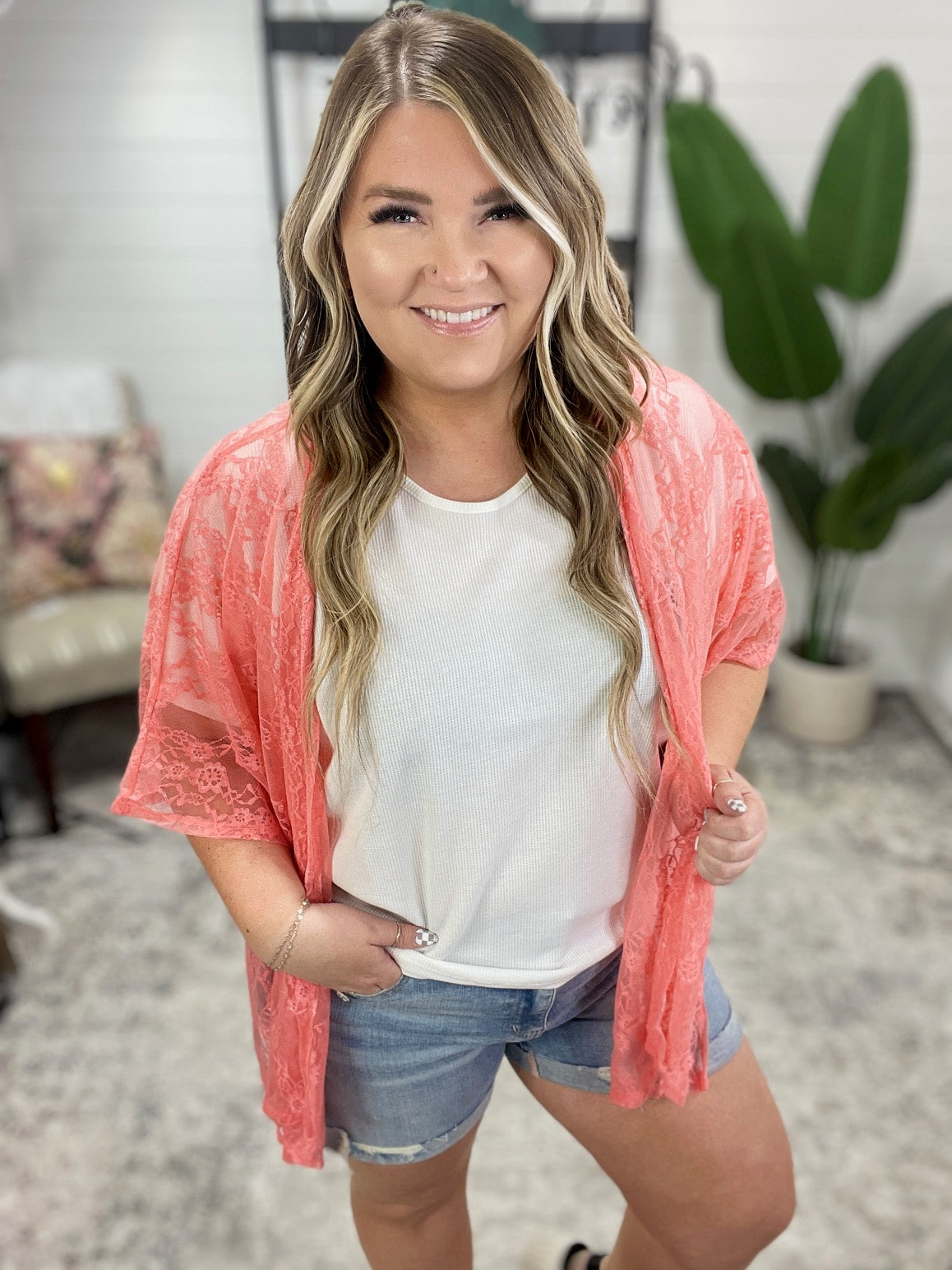 Transform your wardrobe with our Good Days Ahead Lace Kimono! Made with stretch lace, this kimono features an open front, dolman sleeves, and side slits for a trendy and comfortable look. Elevate your style and feel confident every day.
