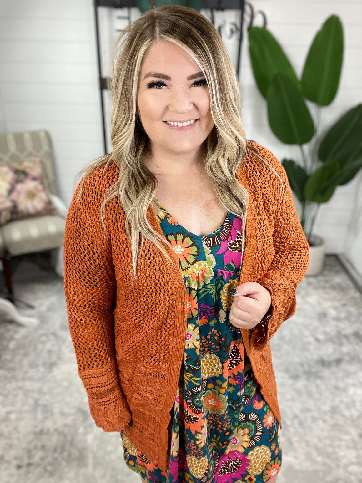 Look luxurious and feel your best while sporting this beautiful burnt orange Groove With Me Cardigan. Crafted with a loose knit, open front, and longline design - this cardigan will keep you cozy without compromising style. The knit border detail and warm color will make you feel glamorous and inspire confidence!