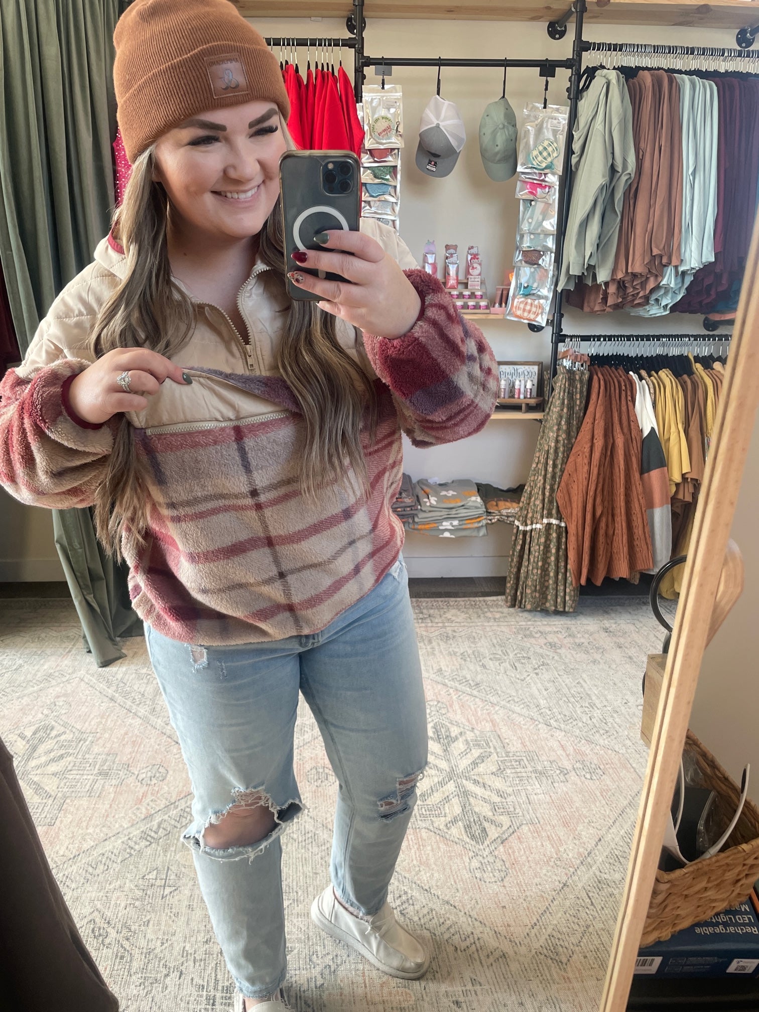 HALF ZIP UP LONG SLEEVE QUILTED PUFFER SOLID SHERPA FLEECE PLAID COLOR BLOCK OVERSIZED LOOSE FIT TOP OUTERWEAR WITH HOODIE AND KANGAROO POCKET