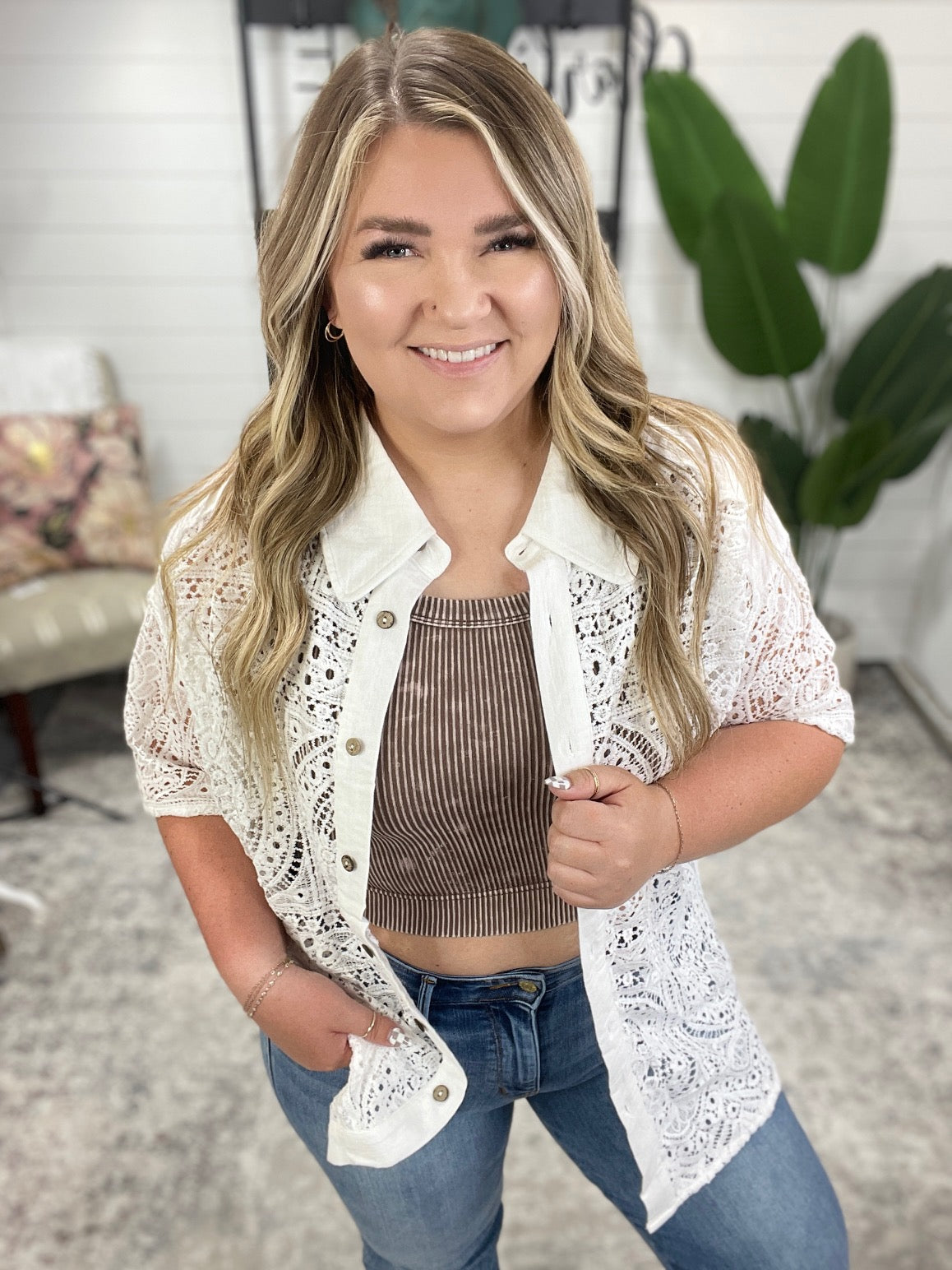 Take your wardrobe to new heights with the Head in the Clouds Lace Button Down, featuring a lightweight poly lace with crinkle cotton accents and raw edges. Make a statement with a timeless button-front design - have you ever seen a piece so beautiful? Wear it and feel the difference it makes!