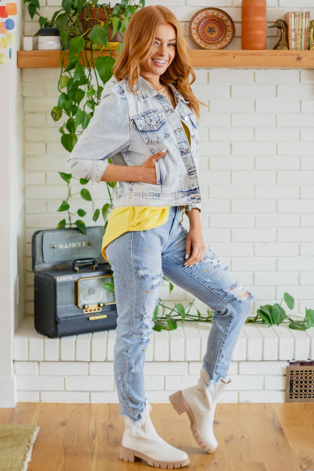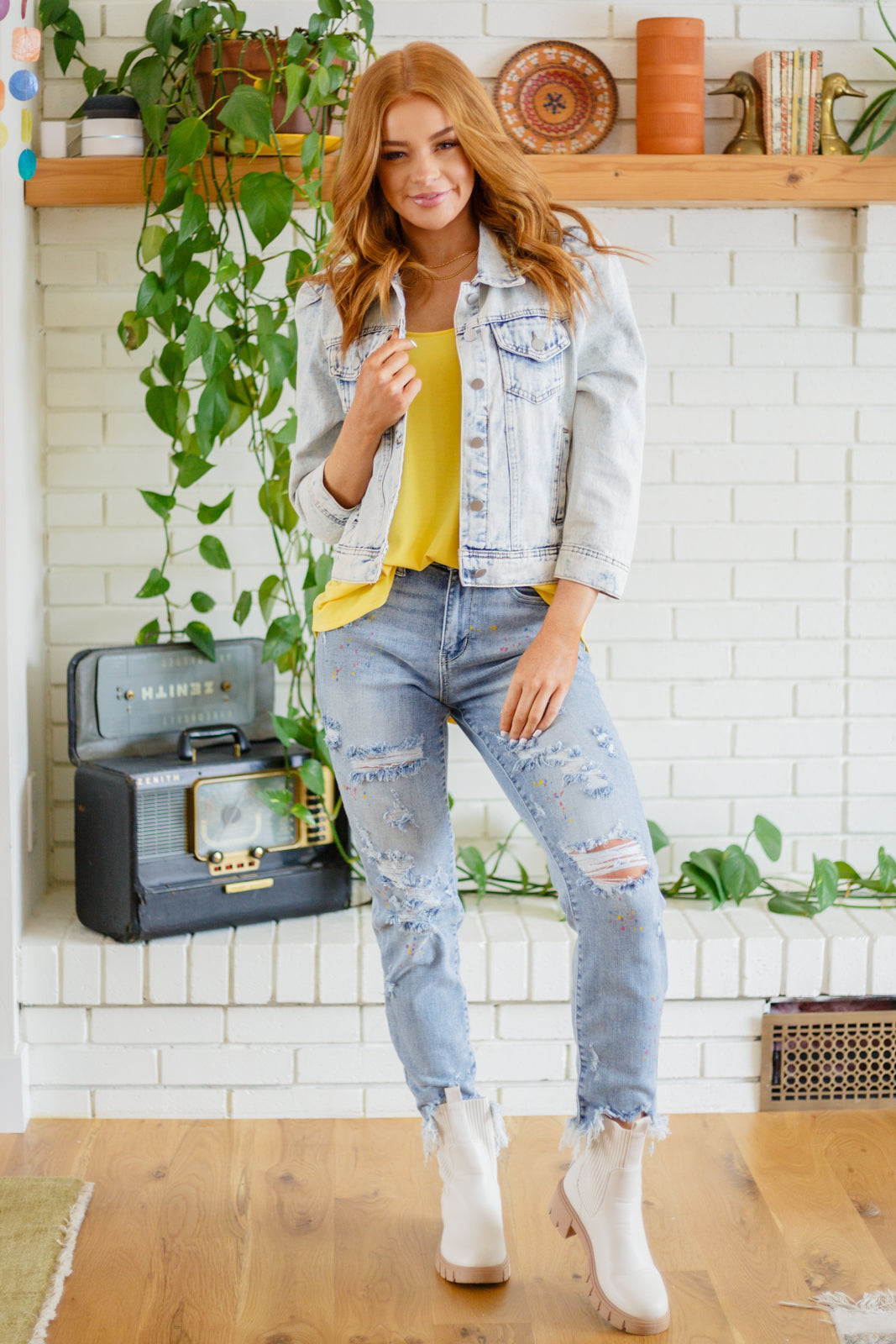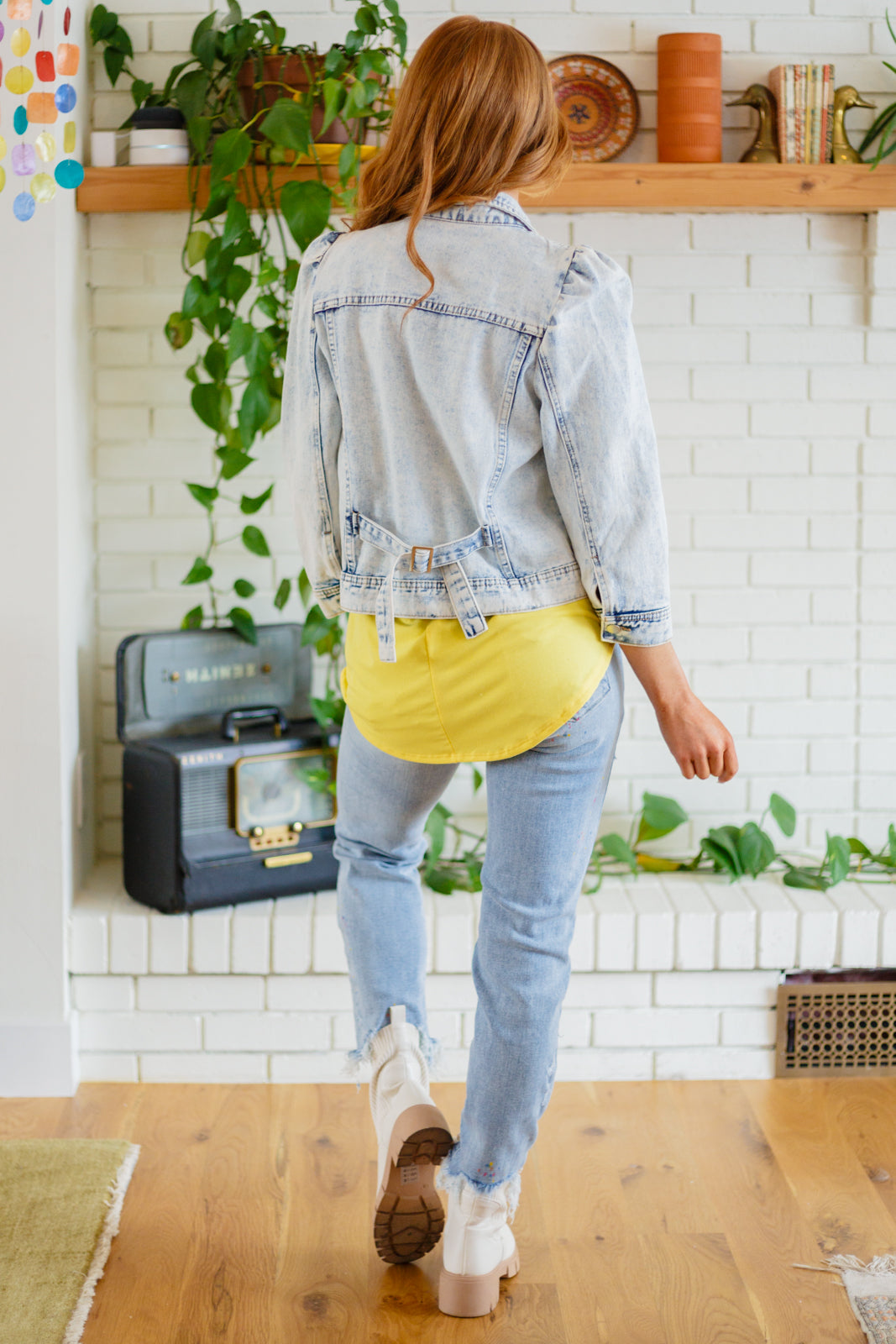 Give your outfits a chic upgrade with the Hello Lovely Quarter Sleeve Denim Jacket! An acid wash denim shapes a collared neckline with a functional button front that falls into a rounded hem with a slightly cropped fit. Three quarter puff sleeves frame this stunning jacket, complete with front flap pockets and two side pockets. Adjustable back detail.