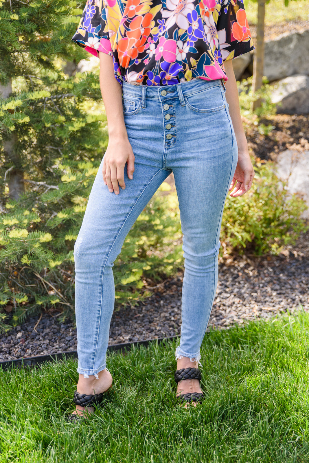 An elevated skinny is just what your jean collection is missing! Complete with a button fly, light wash, and five pocket cut. What more could you need from a staple denim? Pair this with all your tanks and tops this summer for the perfect summer look!
