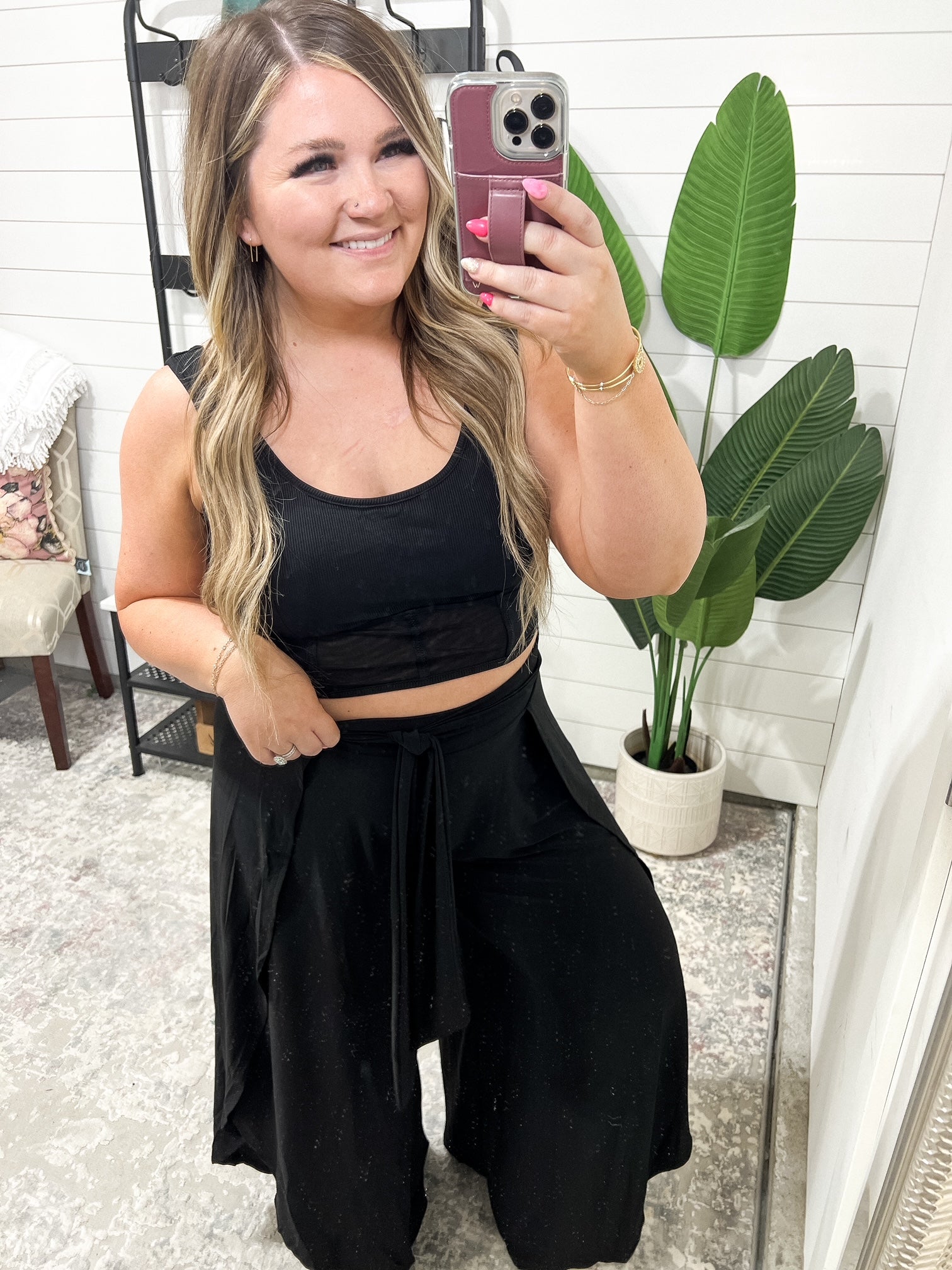 Introducing our Holland Holiday Tulip Pants in Black! Perfect for any occasion, these pants feature a unique tulip wrap design and a functional front tie. With a half elastic waistline, they offer comfort and style. Made with Bulgari fabric for a luxurious feel. (Claimable benefits: style, comfort, luxury)