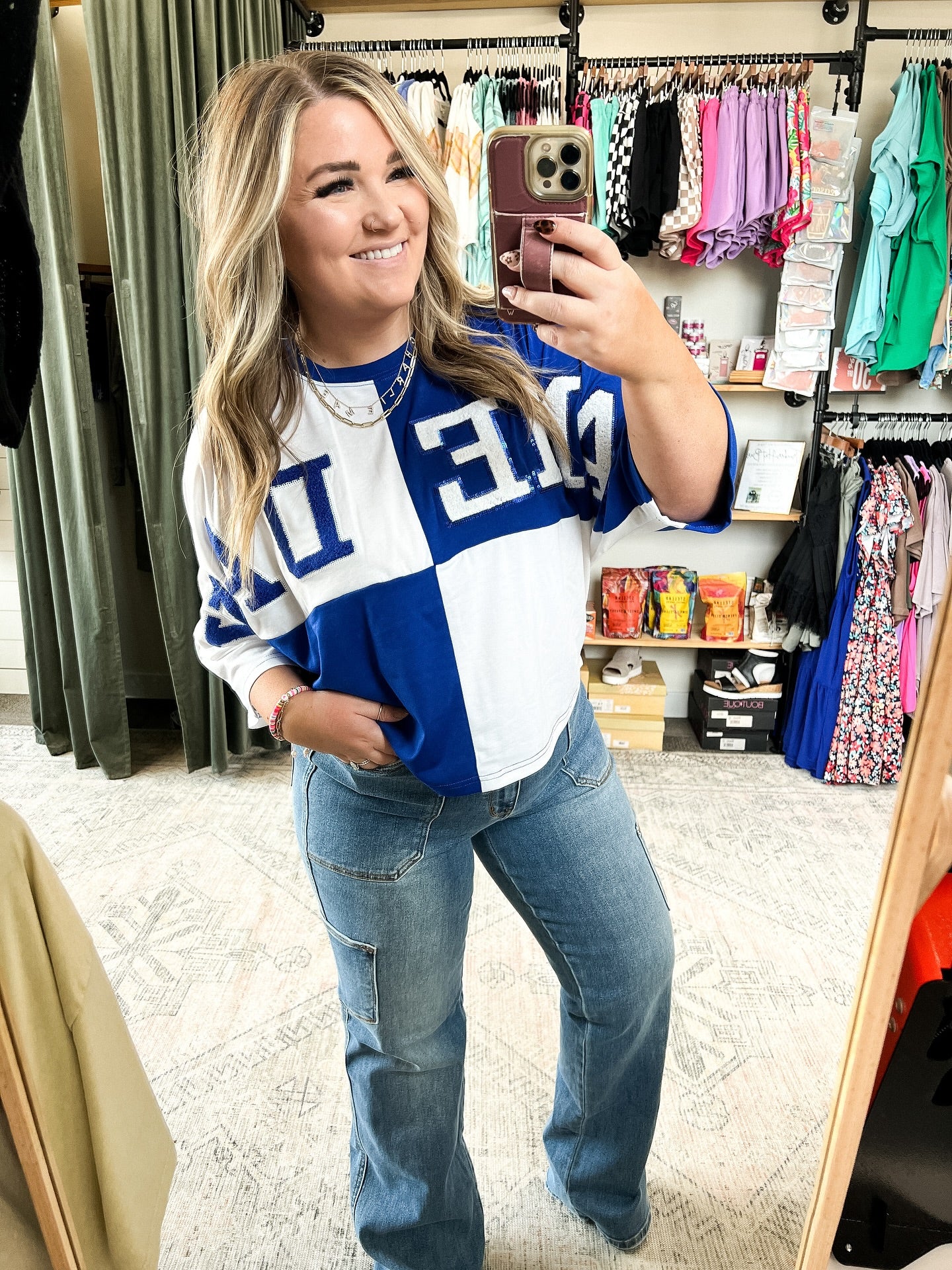 Call the plays and bring the energy—our Huddle Up Color Block Top is made for game day glory! Featuring bold black and white blocking with oversized varsity chenille "GAME DAY" lettering across the front and sleeves, this top brings spirit and style in one major win.