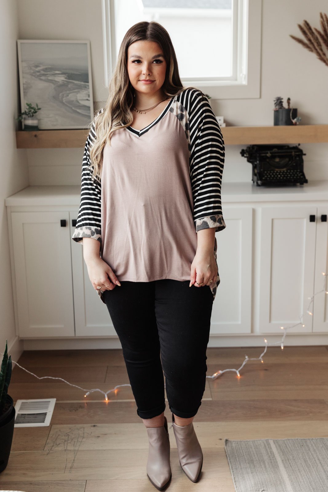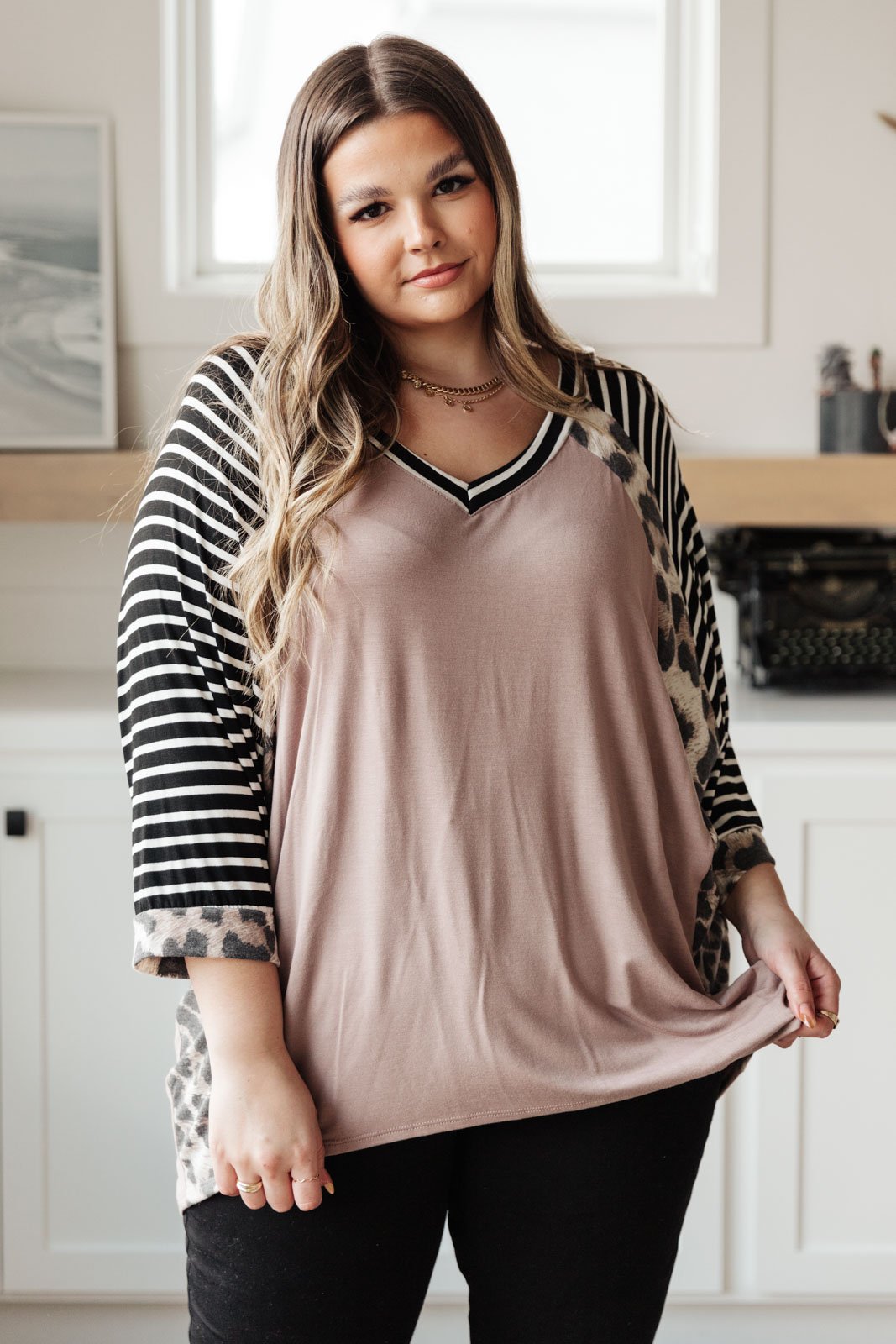 We love this lightweight top with animal print detail! It's easy to layer it under a cardigan or wear it on it's own! Pair it with some black jeans & you'll be out the door in no time.