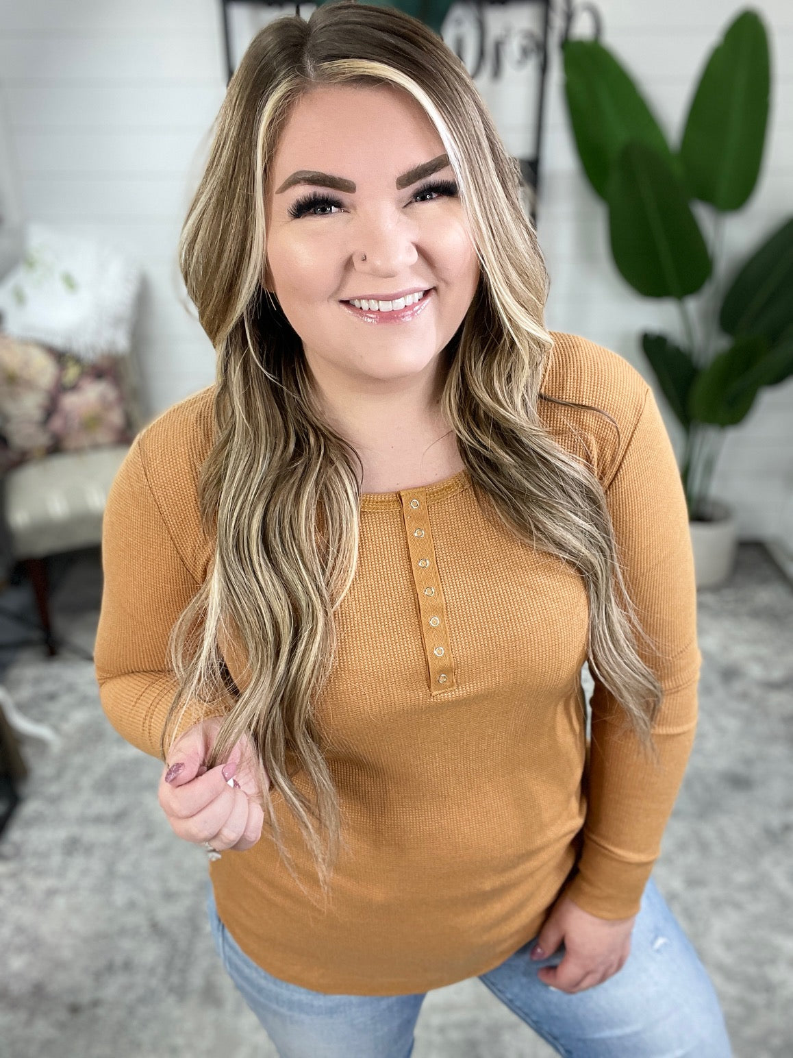 Introducing our It's Been So Long Henley! Made with soft baby waffle knit, this top offers a comfortable and cozy fit. Its scoop neckline and banded hem add a touch of style, while the snap henley design makes it easy to dress up or down. Say hello to your new go-to top for the upcoming winter season!