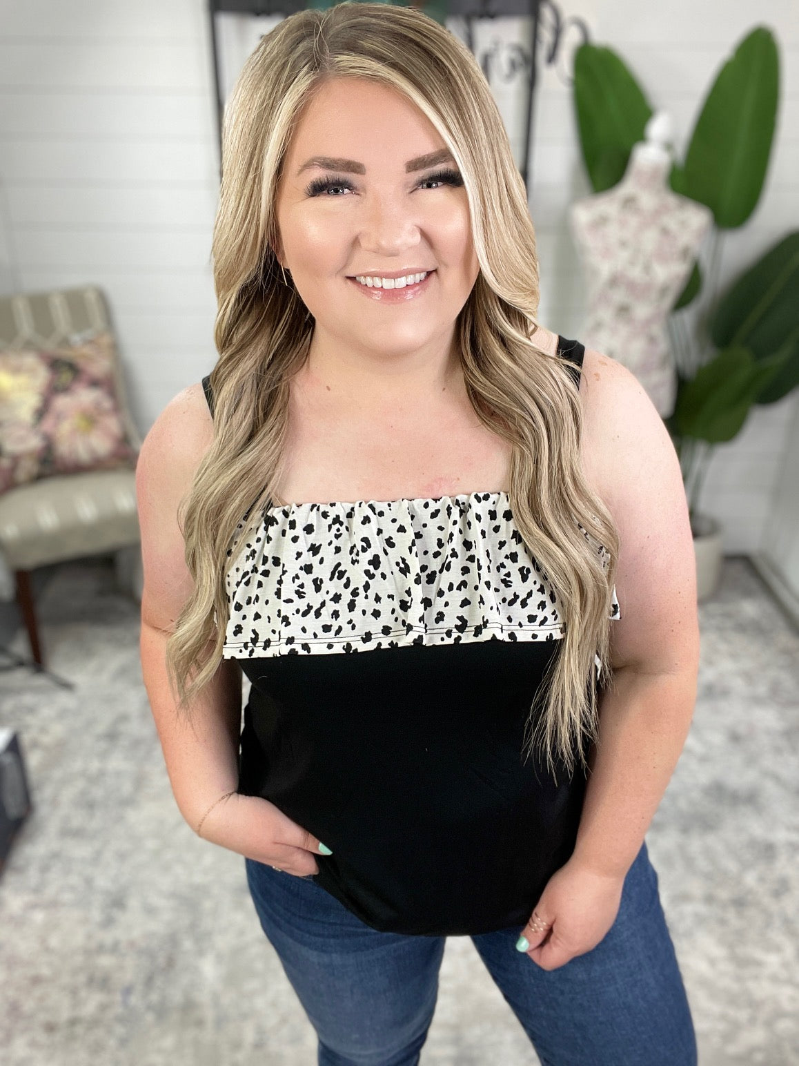 Look and feel your best with the Julie Flounce Detail Tank. Its dalmatian print flounce neckline adds a bold personality to any outfit. Crafted from comfy knit fabric and designed for an easy fit, it will be your go-to piece for everyday wear!