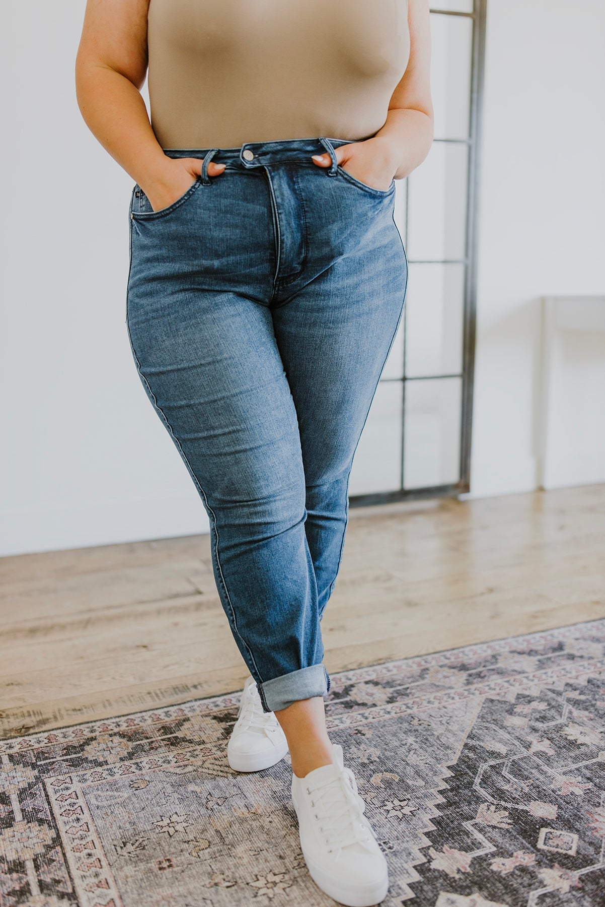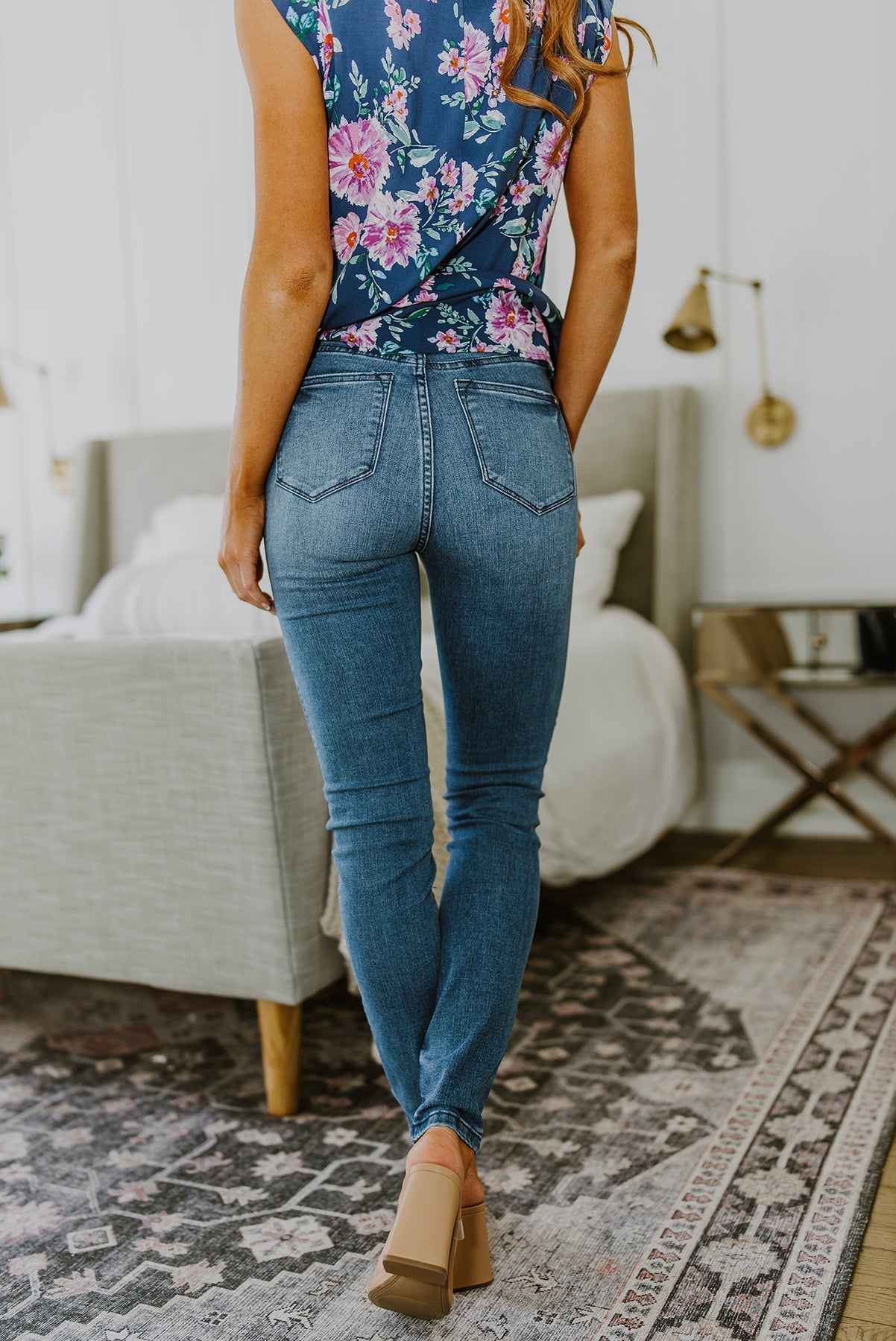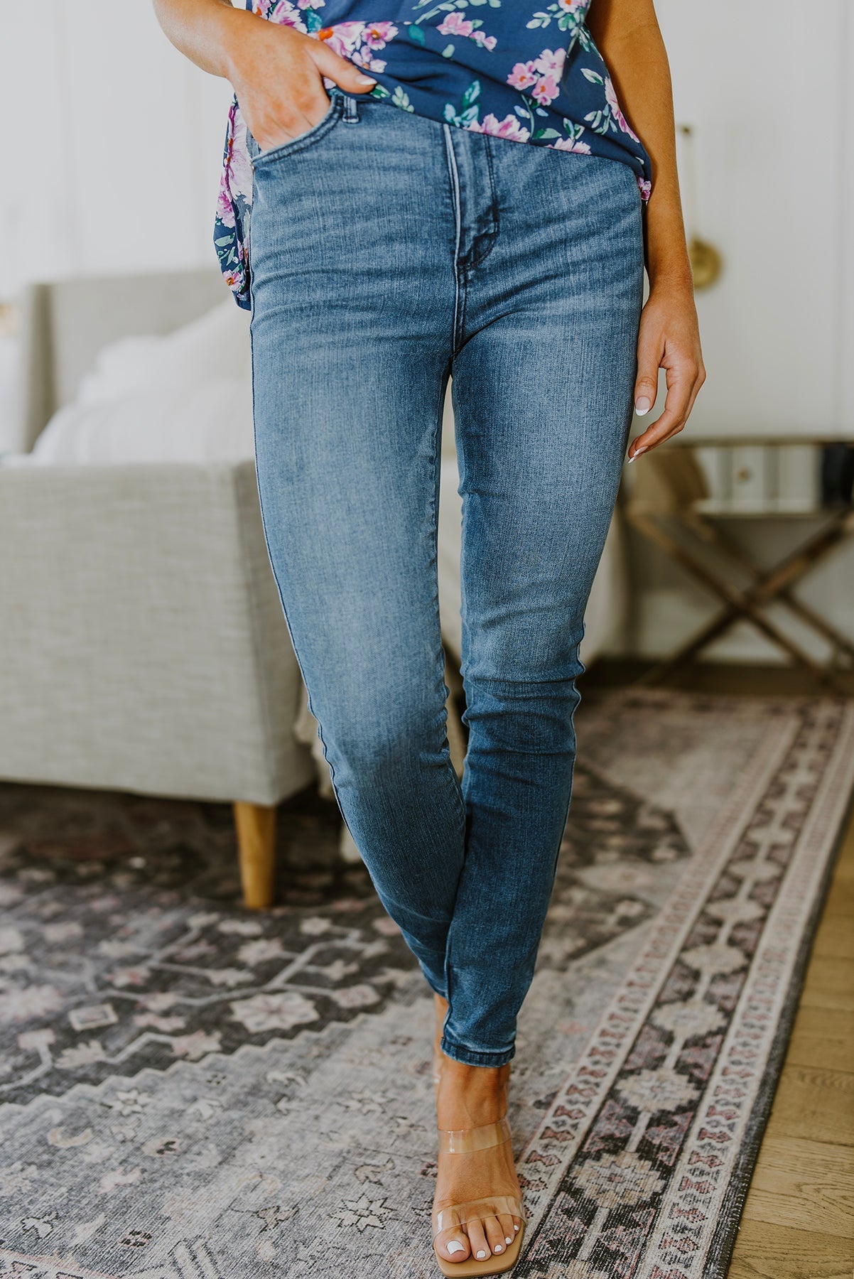 Introducing the Juny Hi-Waist Control Top Cool Denim Skinny, a must-have addition to your denim collection. With slimming tummy control tech, including offset tabbed waistband with a double button, you'll look and feel confident in this medium wash, non-distressed classic skinny fit. Elevate your style with this versatile piece from the ever amazing Judy Blue.