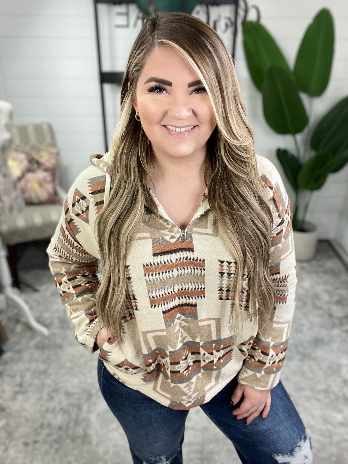 Experience ultimate warmth and style with the Just Going For It Aztec Hoodie. Featuring a thick woven brushed flannel, a hooded 1/2 zip, front pockets, and a dropped shoulder fit, this hoodie is perfect for any casual outing. Finished off with an eye-catching Aztec design, you'll be sure to stand out in any crowd. Get out, go for it, and rock this hoodie!